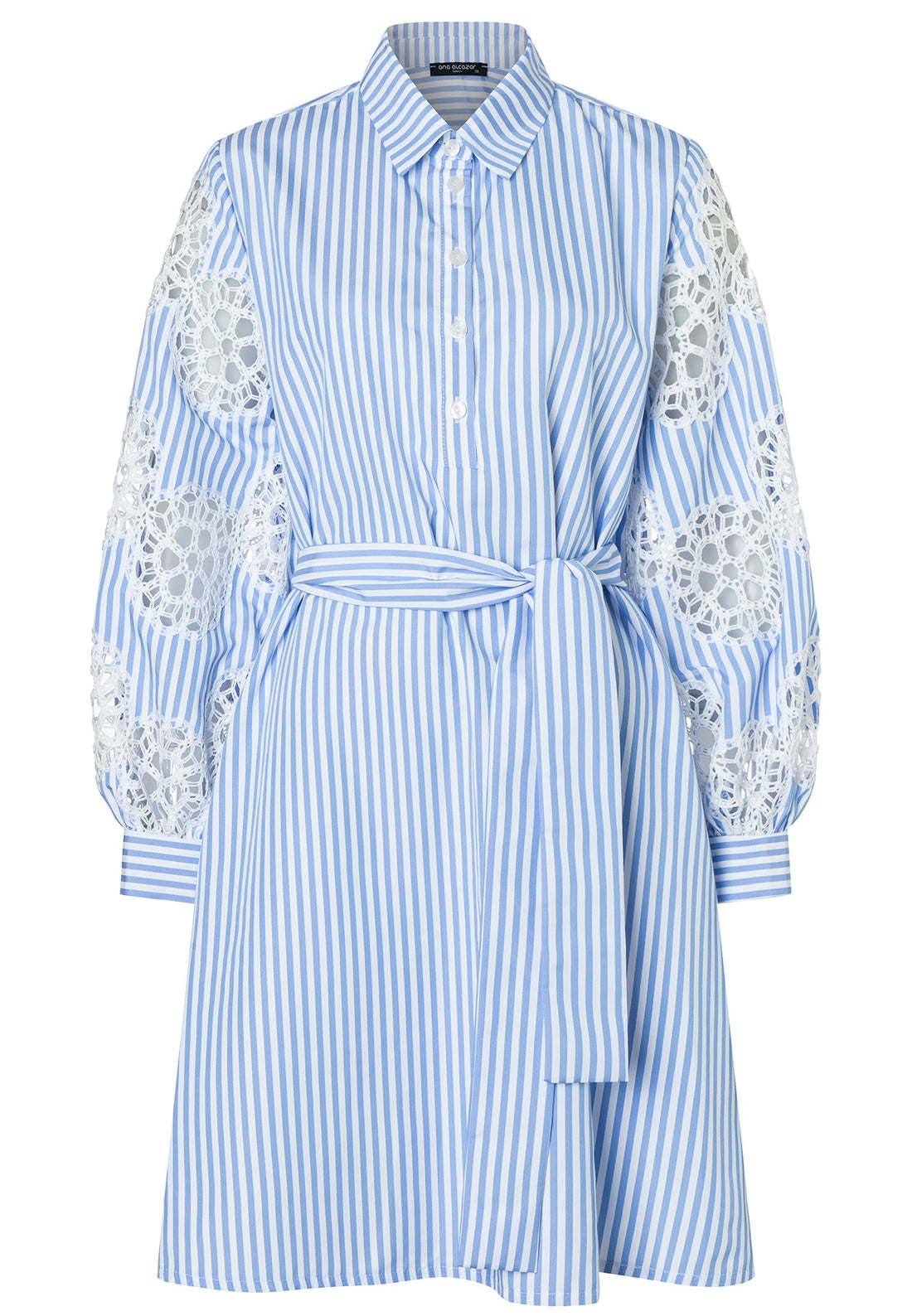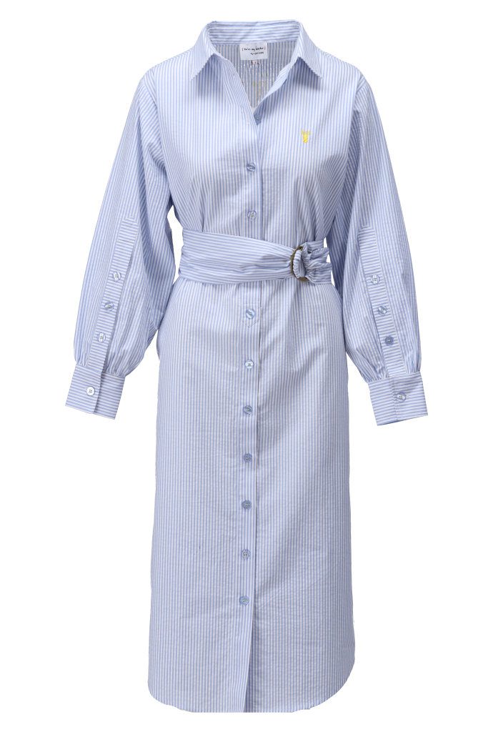Stijlvolle blousejurk met subtiele strepen en een vrouwelijke strikceintuur. De knoopsluiting en lange mouwen geven...
