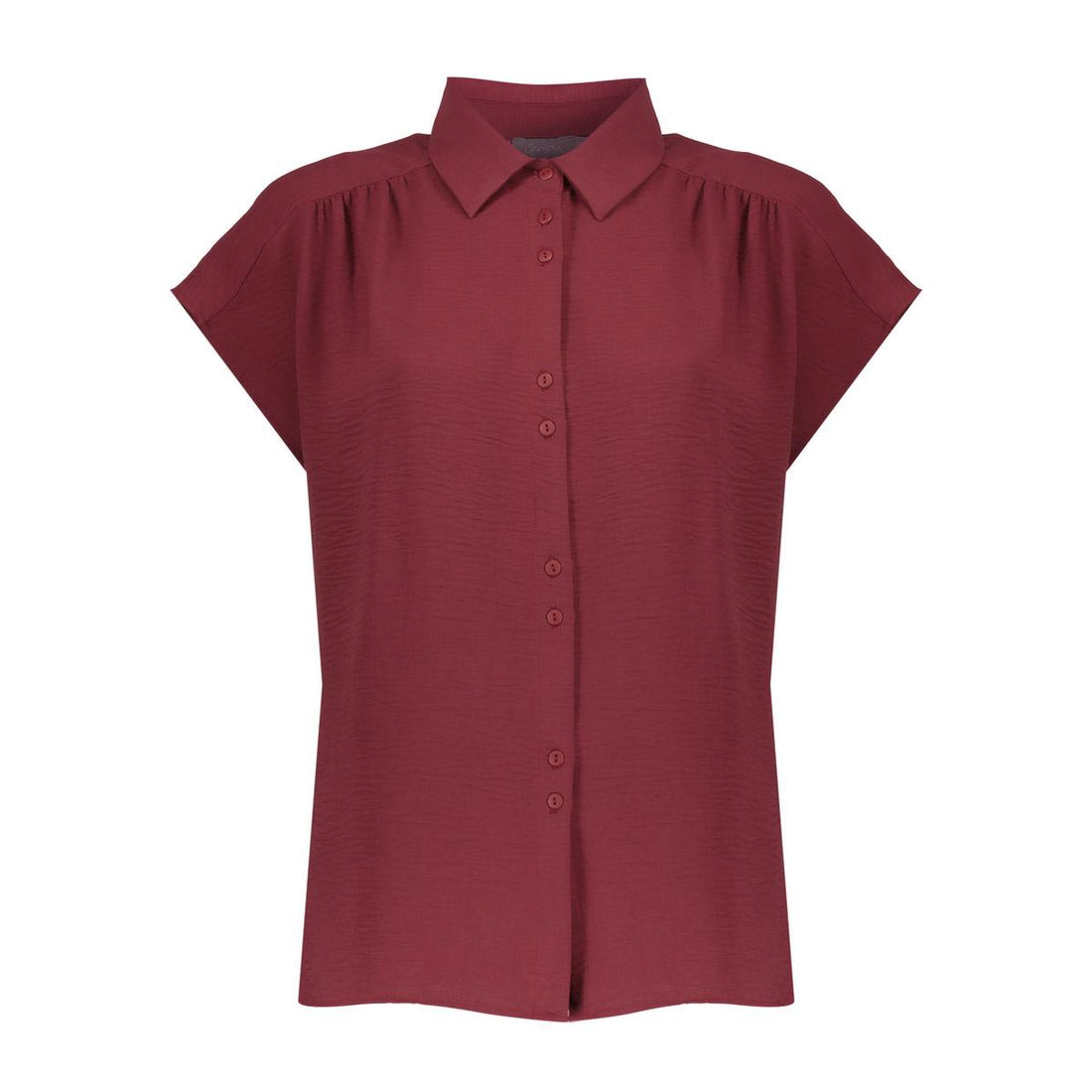 Stijlvolle bordeauxrode blouse met korte mouwen en klassieke kraag. De luchtige stof en de knoopsluiting...