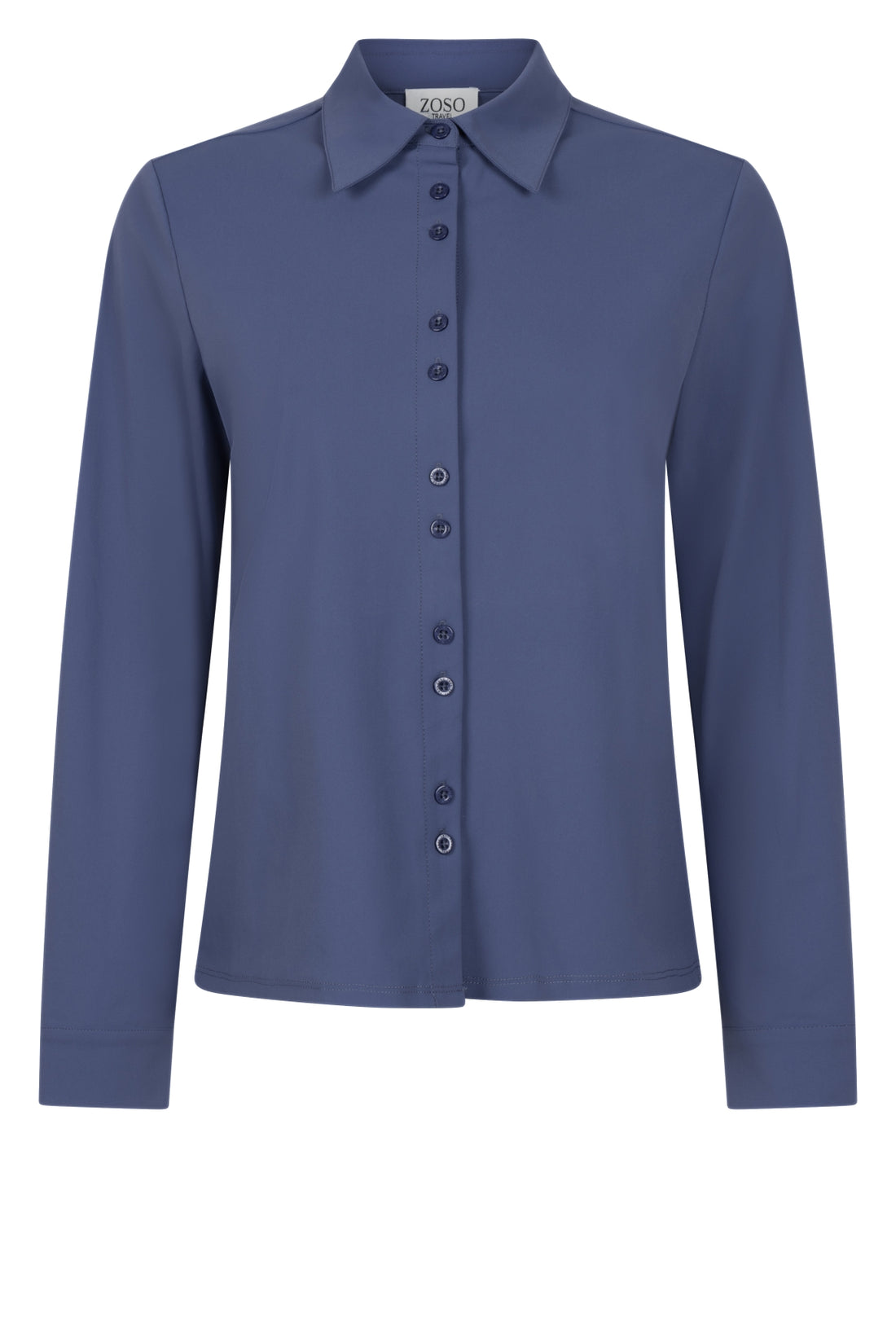 De Travel Blouse Kit Night Blue is een elegante damesblouse in rijke nacht‑blauwe tint, met klassieke kraag, drukknoopsluiting voor,...