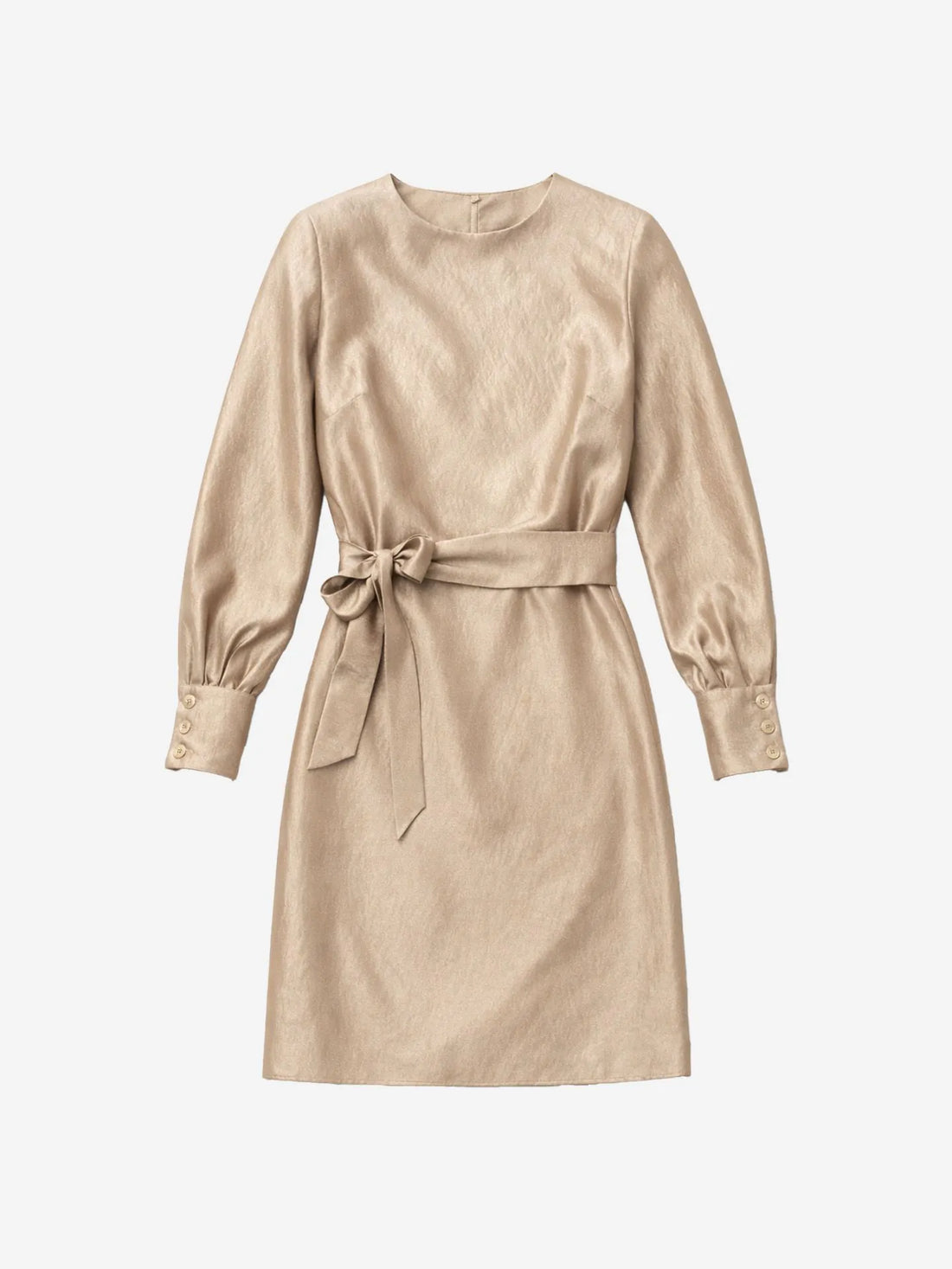A-lijn jurk met subtiele glitters all-over, een ronde hals en een ceintuur bij de taille....