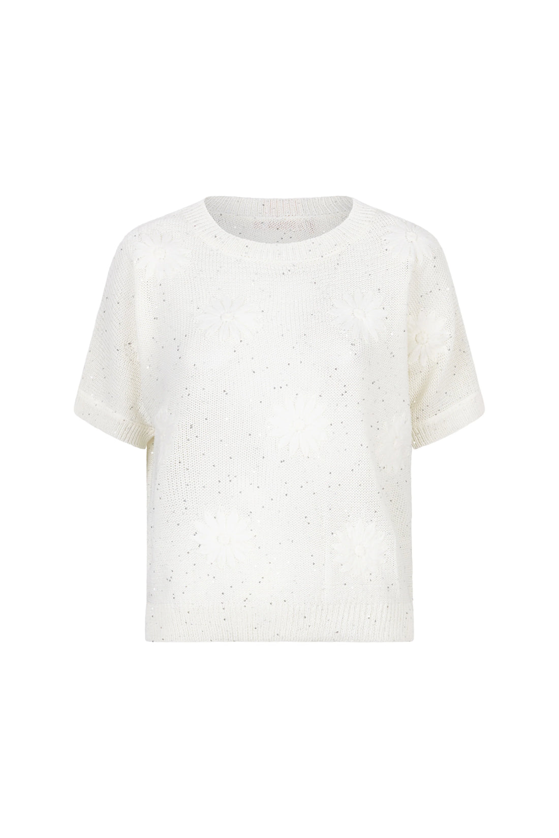 De fijngebreide trui heeft een ronde hals, korte mouwen en subtiele glans met bloemapplicaties voor...