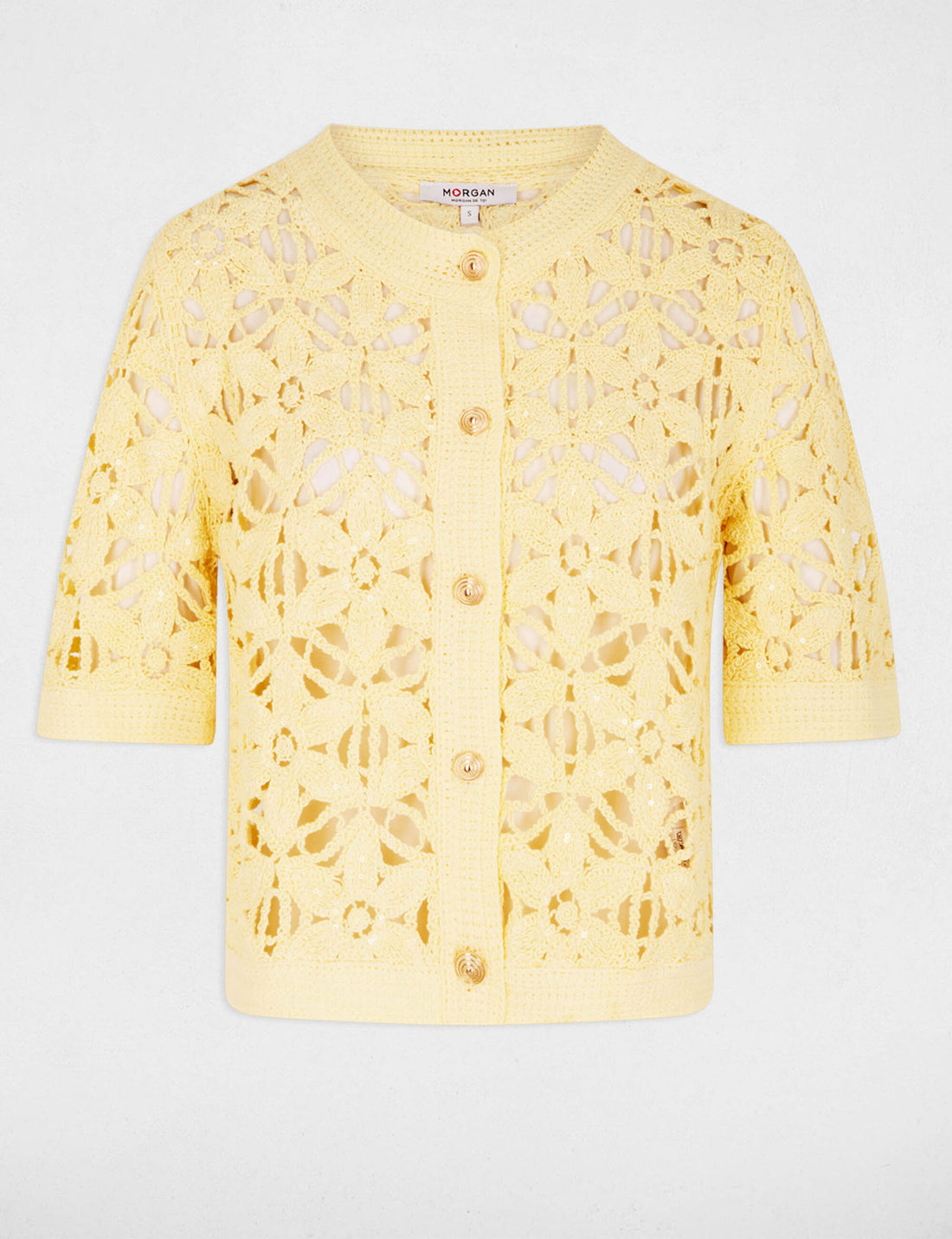 Voeg een vleugje romantiek toe aan je garderobe met deze verfijnde gele cardigan. Het opengewerkte...