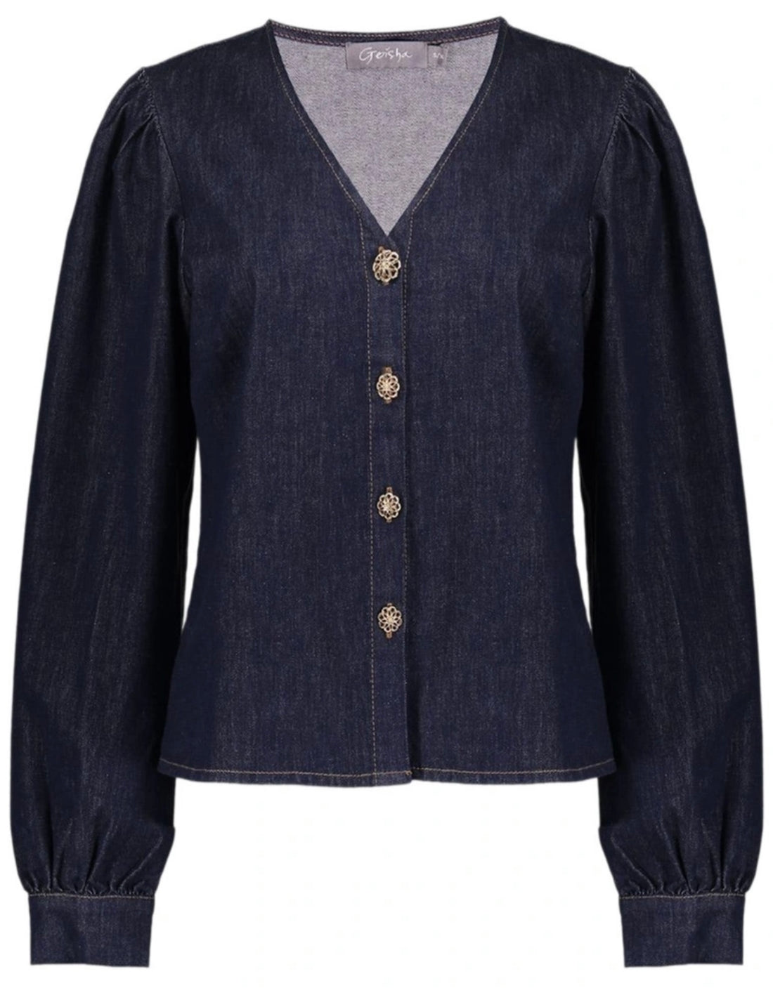 Denim blouse in dark blue. Met haar V-hals, lange pofmouwen en knoopsluiting krijgt deze blouse...