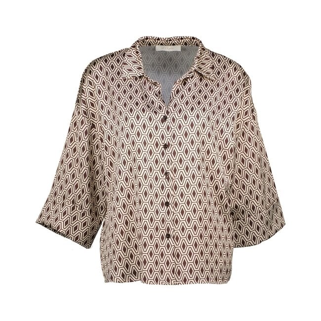 Deze stijlvolle blouse combineert comfort met een trendy retro look. De geometrische print in warme...