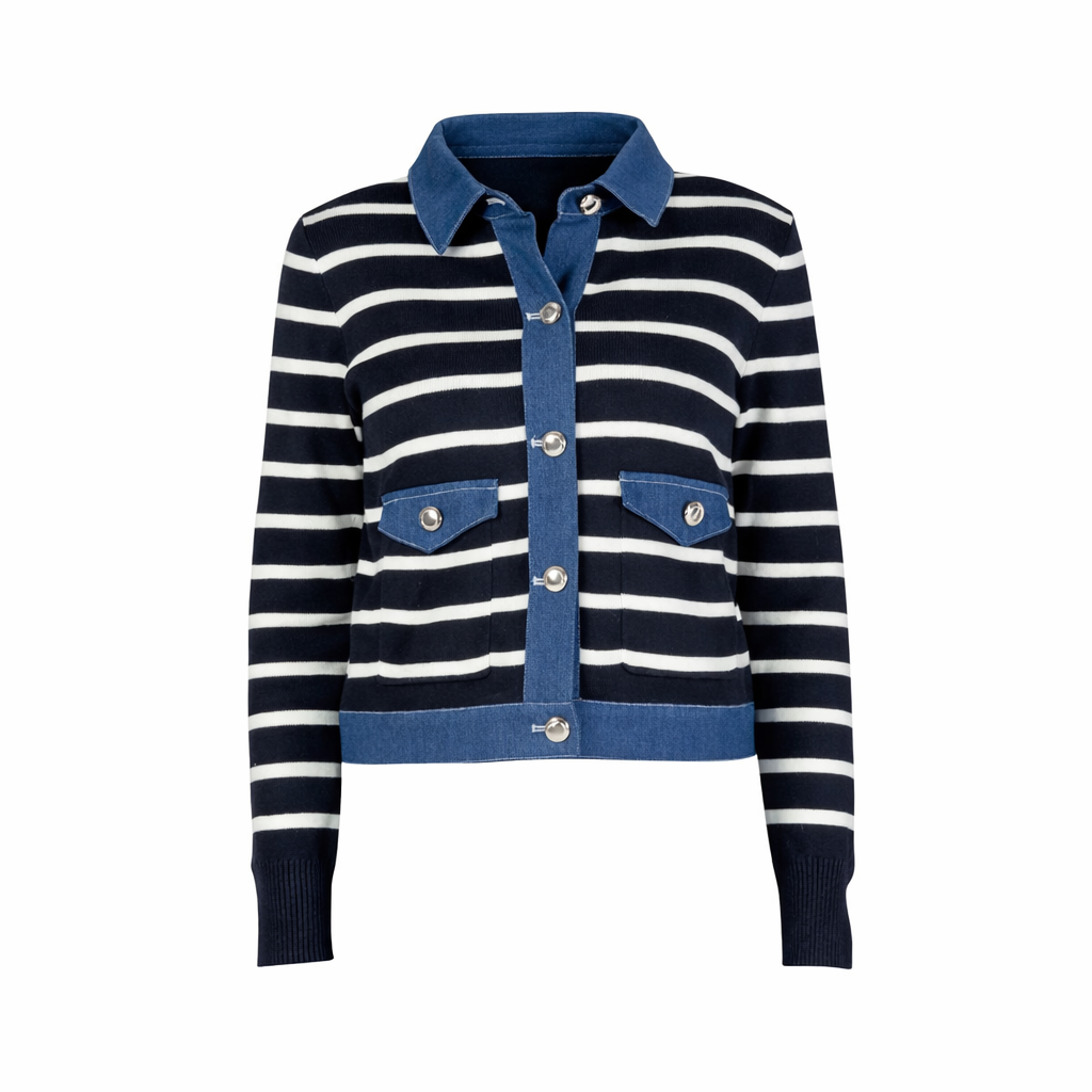 Dit stijlvolle vest combineert een tijdloos streeppatroon met moderne denimdetails. De contrasterende kraag, knoopsluiting en...