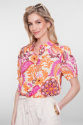 De blouse heeft een klassieke kraag, knoopsluiting en korte mouwen met een subtiel pofeffect, wat zorgt voor een vrouwelijke en trendy uitstraling. Dankzij de lichte, comfortabele stof draagt hij heerlijk, zowel casual als iets chiquer gestyled.