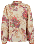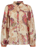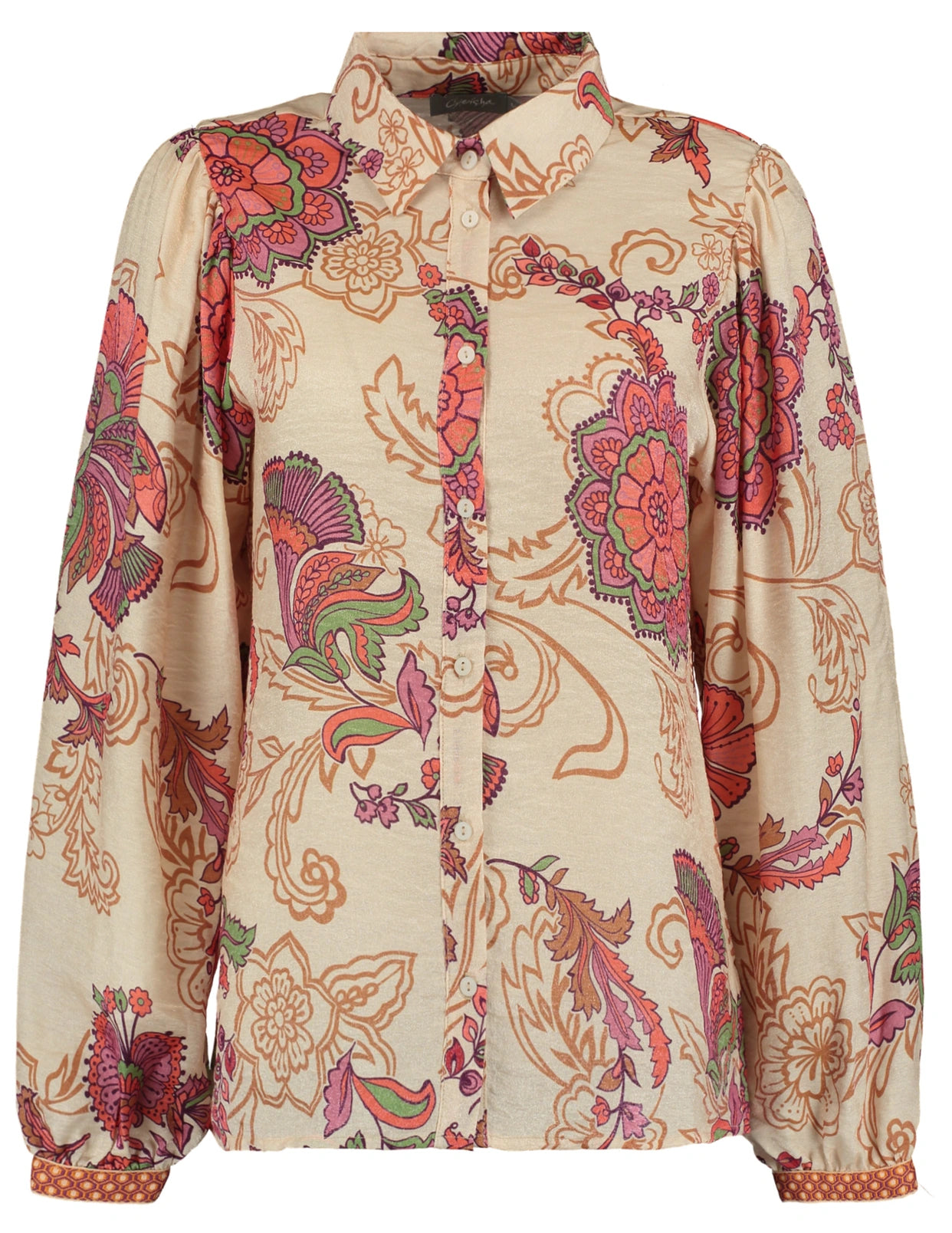 Deze blouse heeft een rijke paisley en bloemprint in warme tinten zoals oranje, roze, rood en groen op een lichte ondergrond.