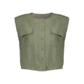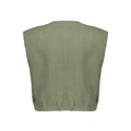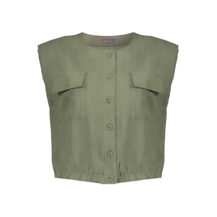 Deze mouwloze blouse in khakigroen biedt je een veelzijdige basis voor je garderobe. De blouse heeft een ronde halslijn en sluit met een knoopsluiting over de gehele lengte aan de voorzijde.