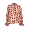 De zachte crèmekleur met bruine polkadots geeft een stijlvolle retrolook, terwijl de strik bij de hals zorgt voor een chique en vrouwelijke touch.