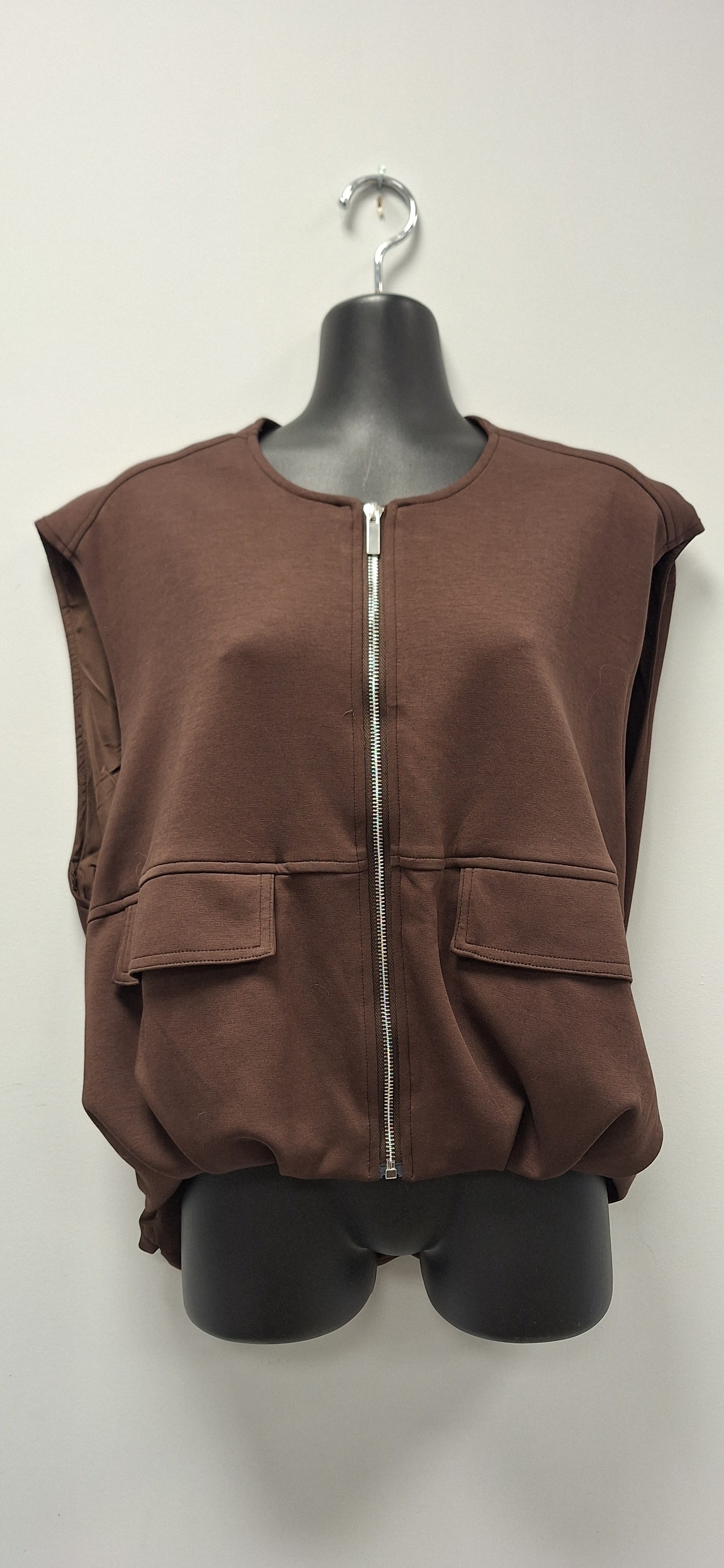 Dit stijlvolle mouwloze vest in een warme chocoladebruine kleur is de perfecte toevoeging aan je garderobe. Het vest heeft een ronde halslijn, een zilverkleurige ritssluiting en twee praktische klepzakken aan de voorkant.
