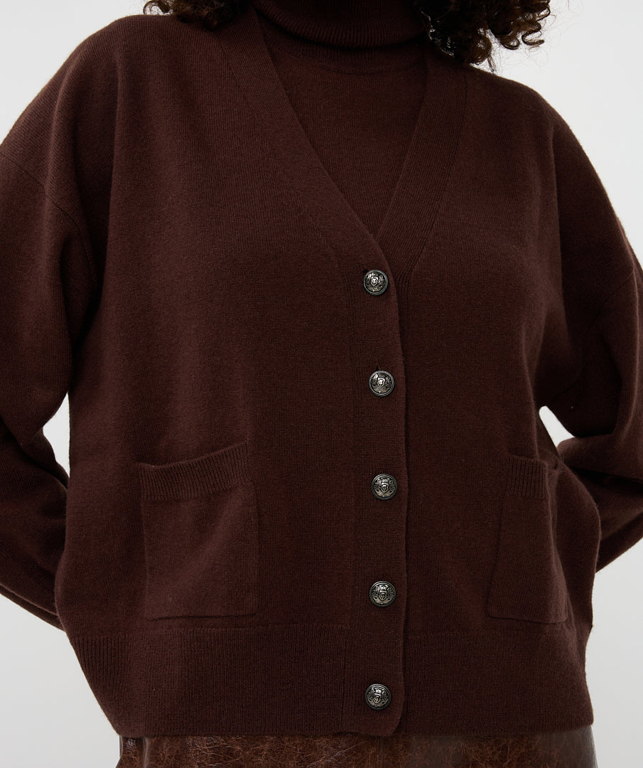 Dit gebreide vest van Esqualo is een echte musthave voor het najaar. Het model heeft een relaxte pasvorm, een elegante V-hals en een fijne knoopsluiting met subtiel glanzende knopen. De warme chocoladetint zorgt voor een rijke, luxe uitstraling.