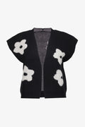Dit zwarte cardigan met grote witte bloemen geeft je outfit direct een speelse en frisse uitstraling.