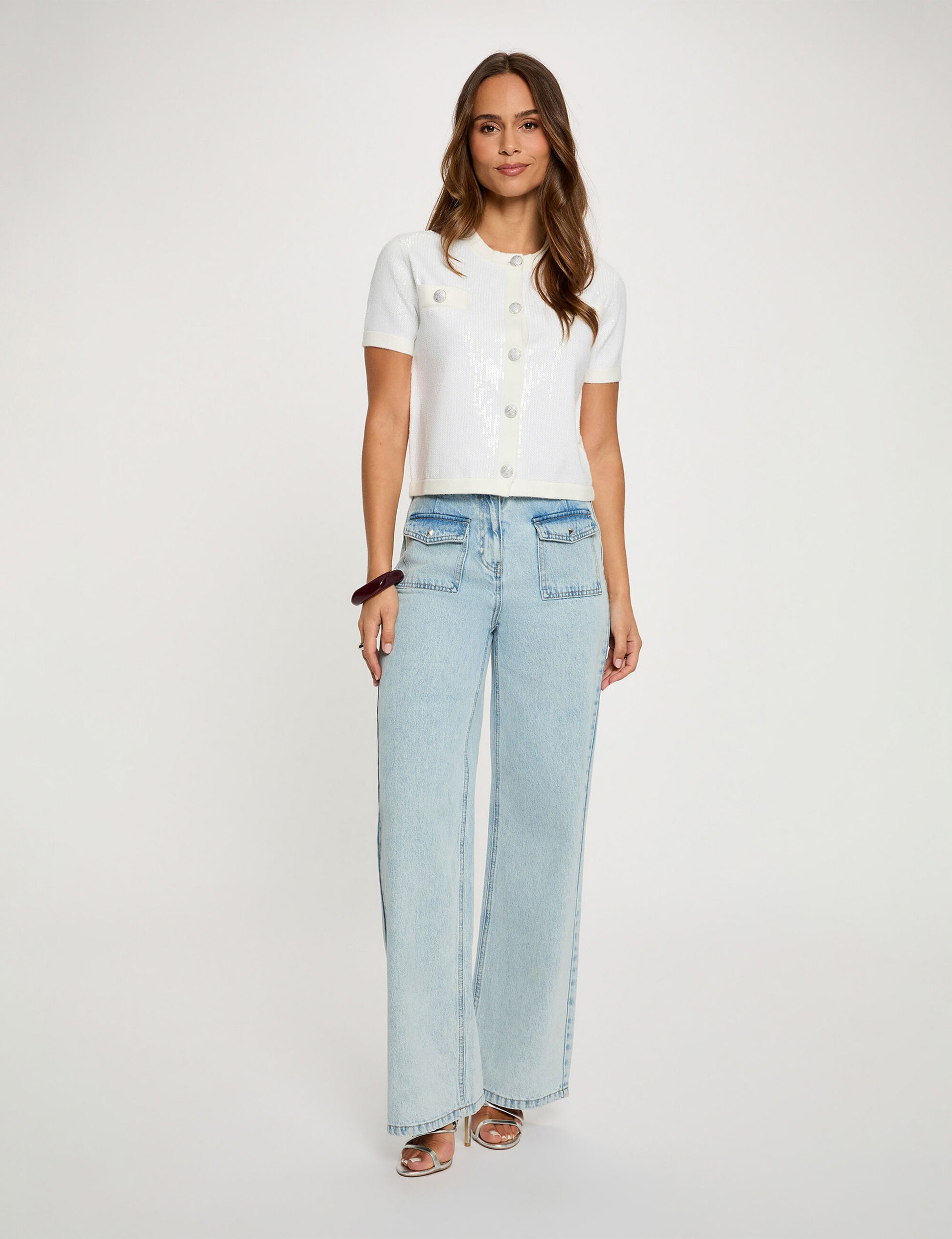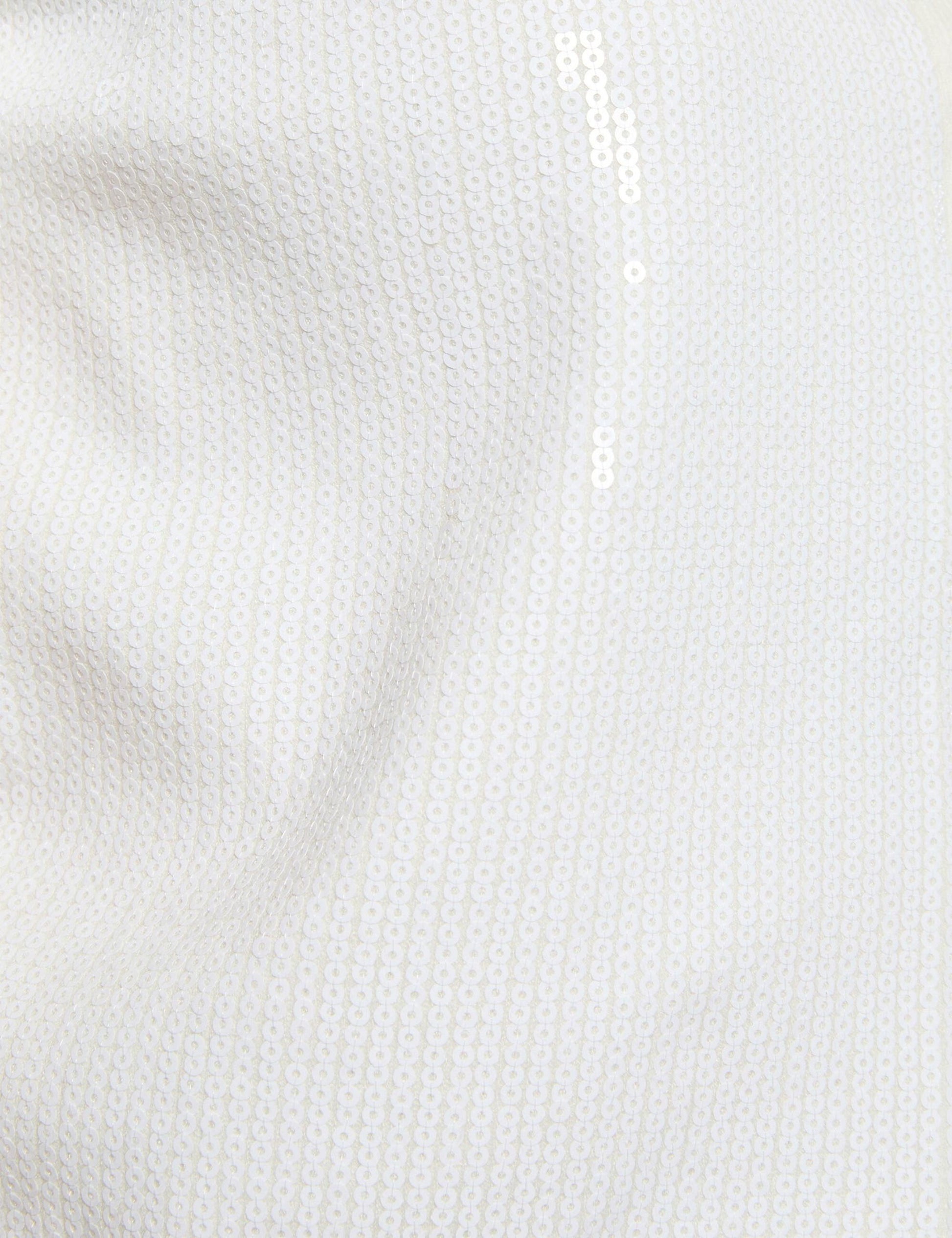 Deze stijlvolle witte cardigan is een verfijnde toevoeging aan je garderobe. Het korte model is volledig afgewerkt met subtiele pailletten die zorgen voor een zachte glans en een luxe uitstraling.