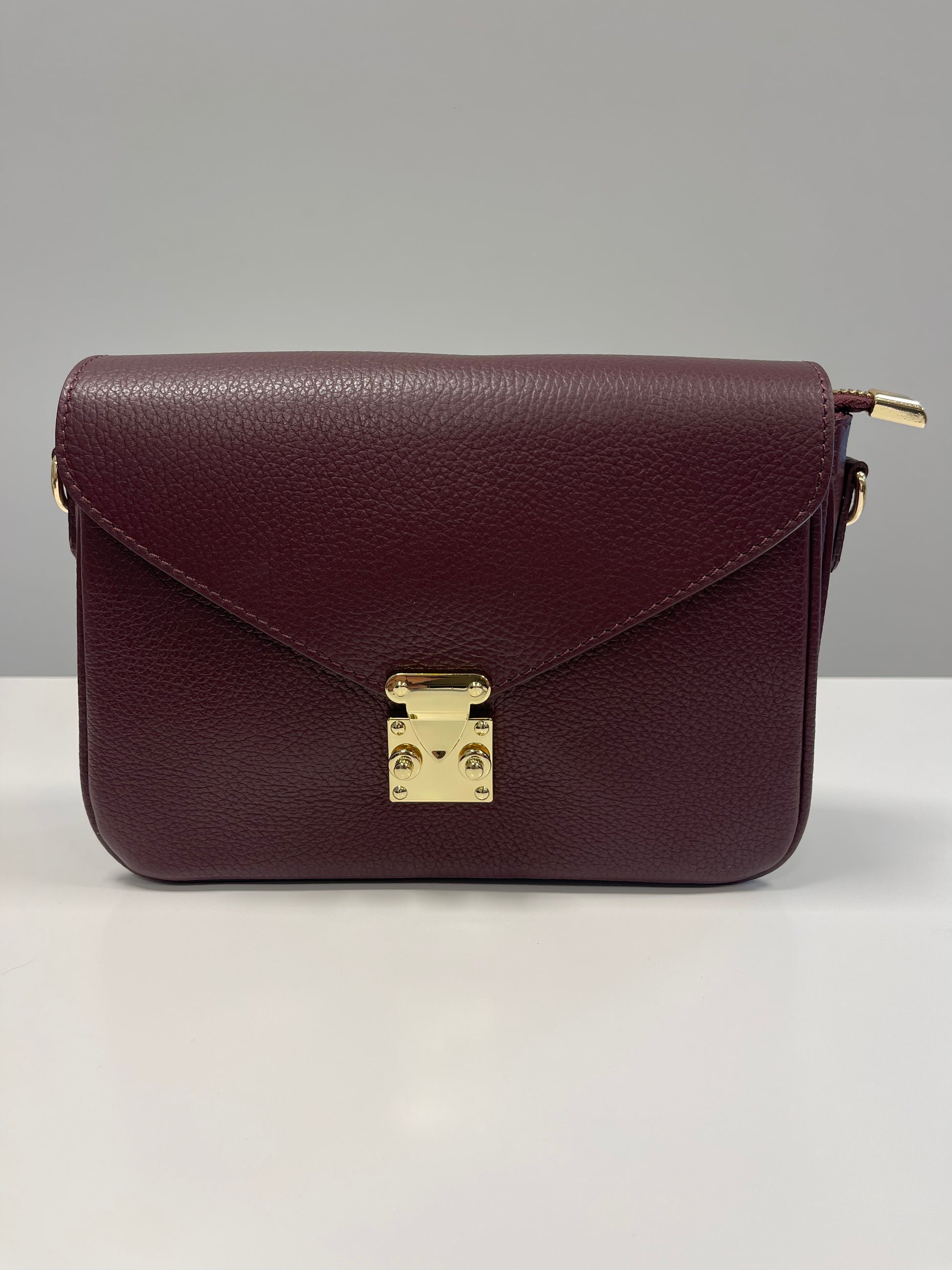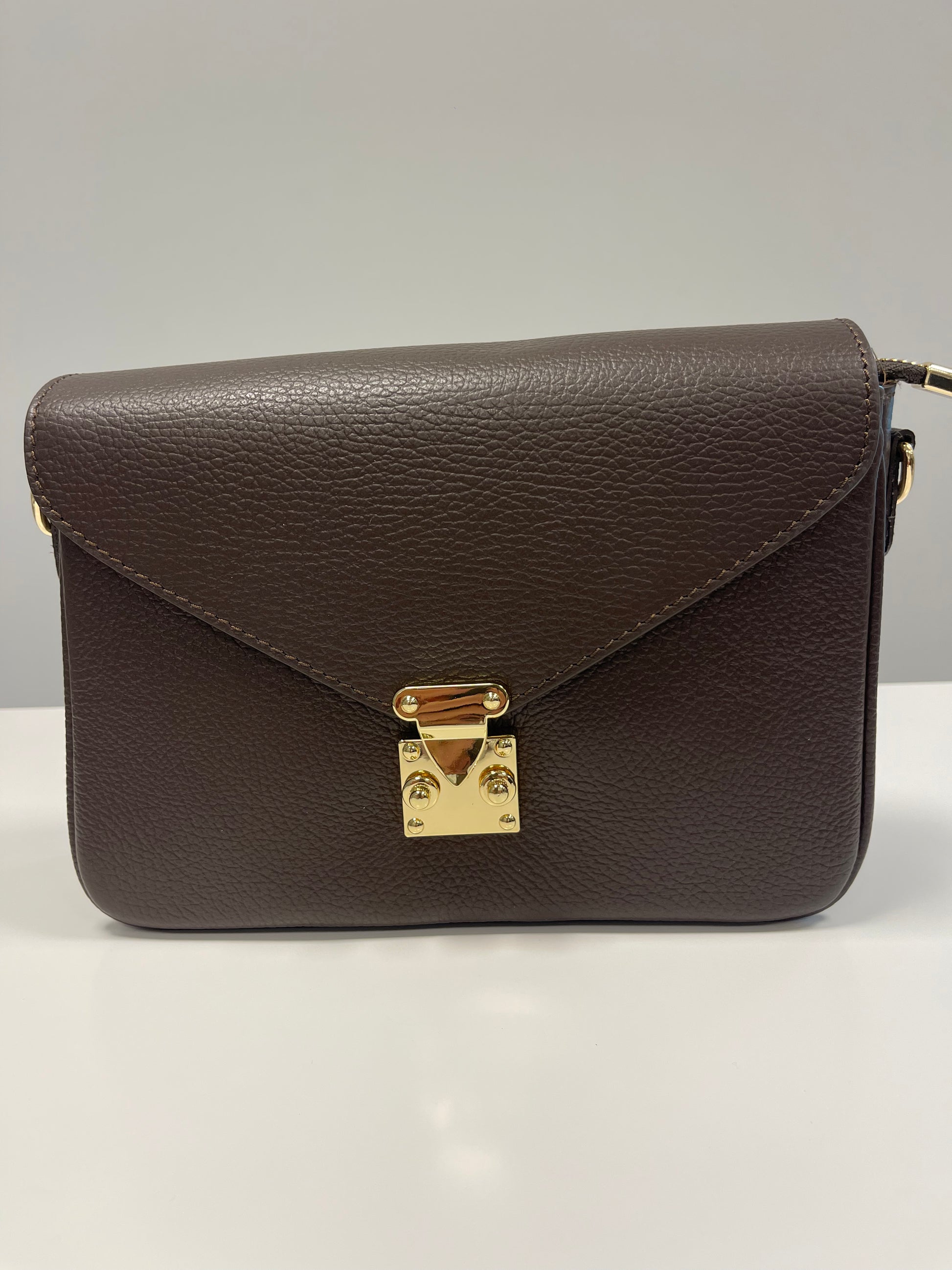 De Esther is een elegante schoudertas van generfd leer met goudkleurige details, praktisch ingedeeld met vakken en rits, en voorzien van een verstelbare schouderriem. Tijdloos, stijlvol en functioneel.