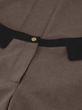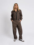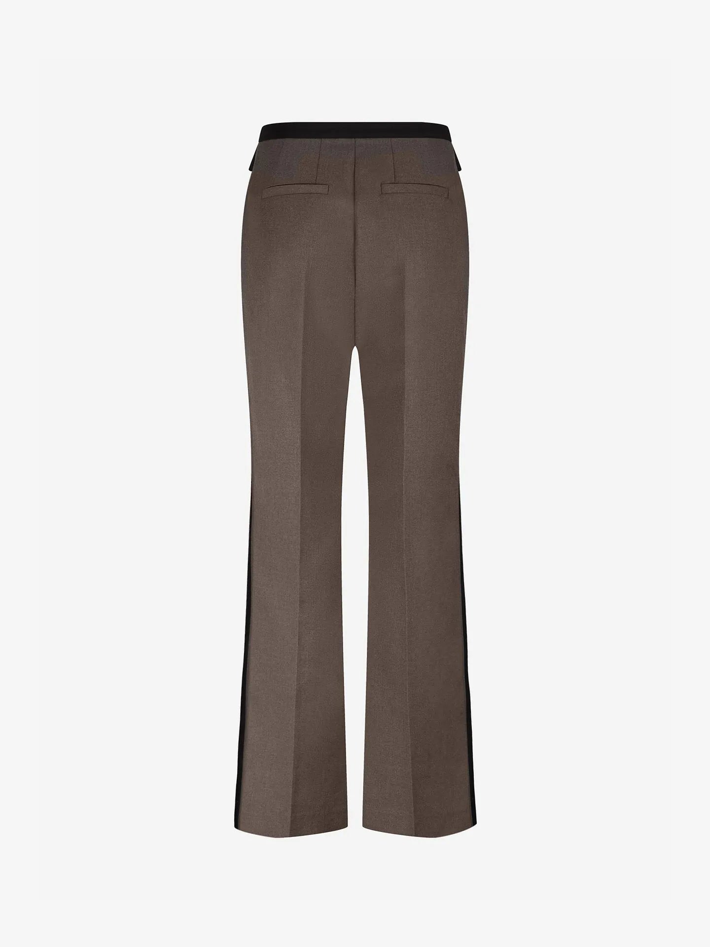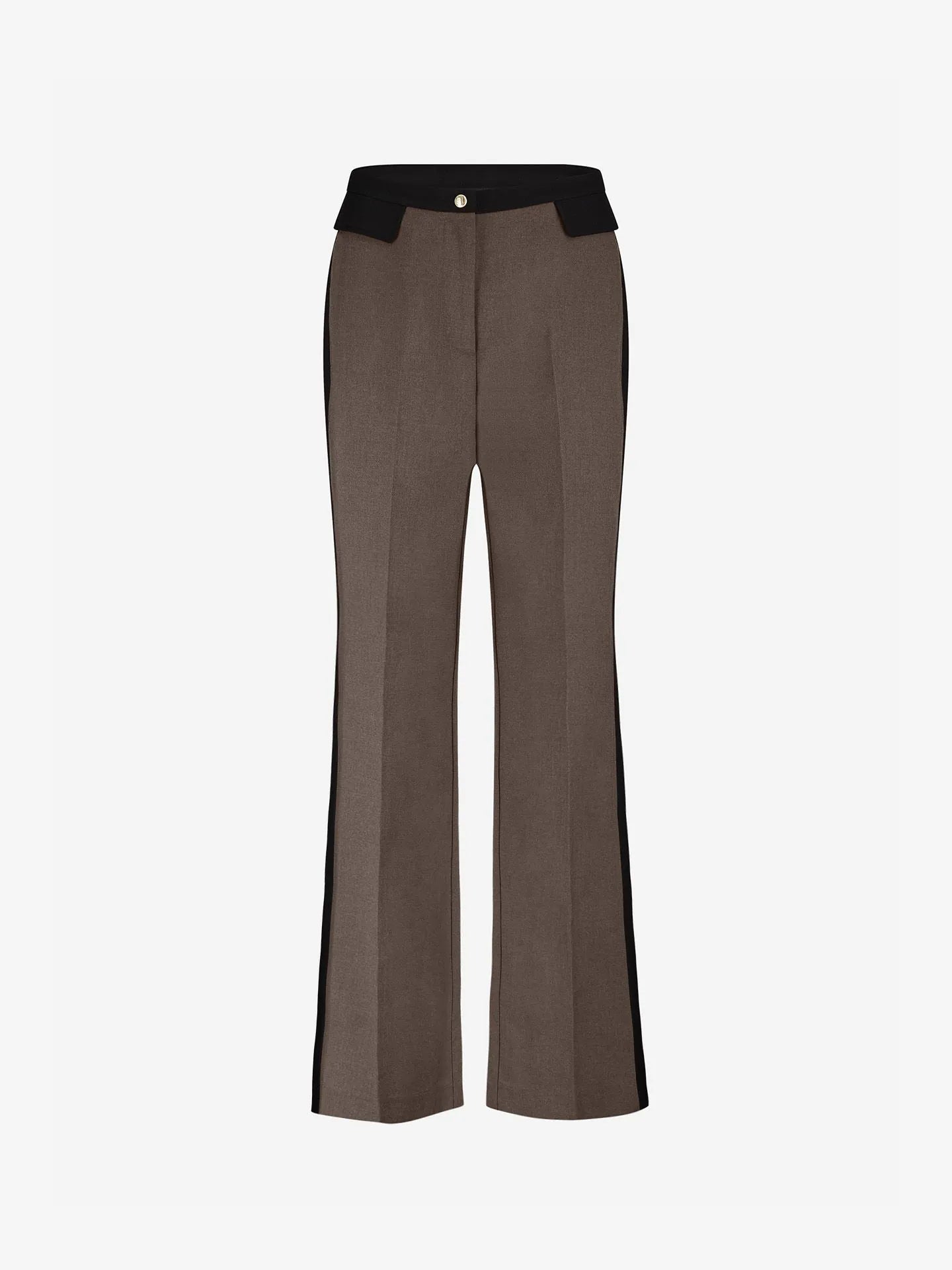 Pantalon met rechte pijpen, een contrasterende tailleband en zijstroken en een lage taille. De broek is voorzien van zakken en een rits- en knoopsluiting.