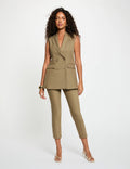 Deze stijlvolle mouwloze blazer is een moderne twist op de klassieke tailoring look. Het strakke silhouet, de dubbele knoopsluiting met goudkleurige knopen en de verfijnde revers geven dit item een elegante en krachtige uitstraling. De arme kleur maakt de blazer tijdloos en makkelijk te combineren, zowel casual als chic.