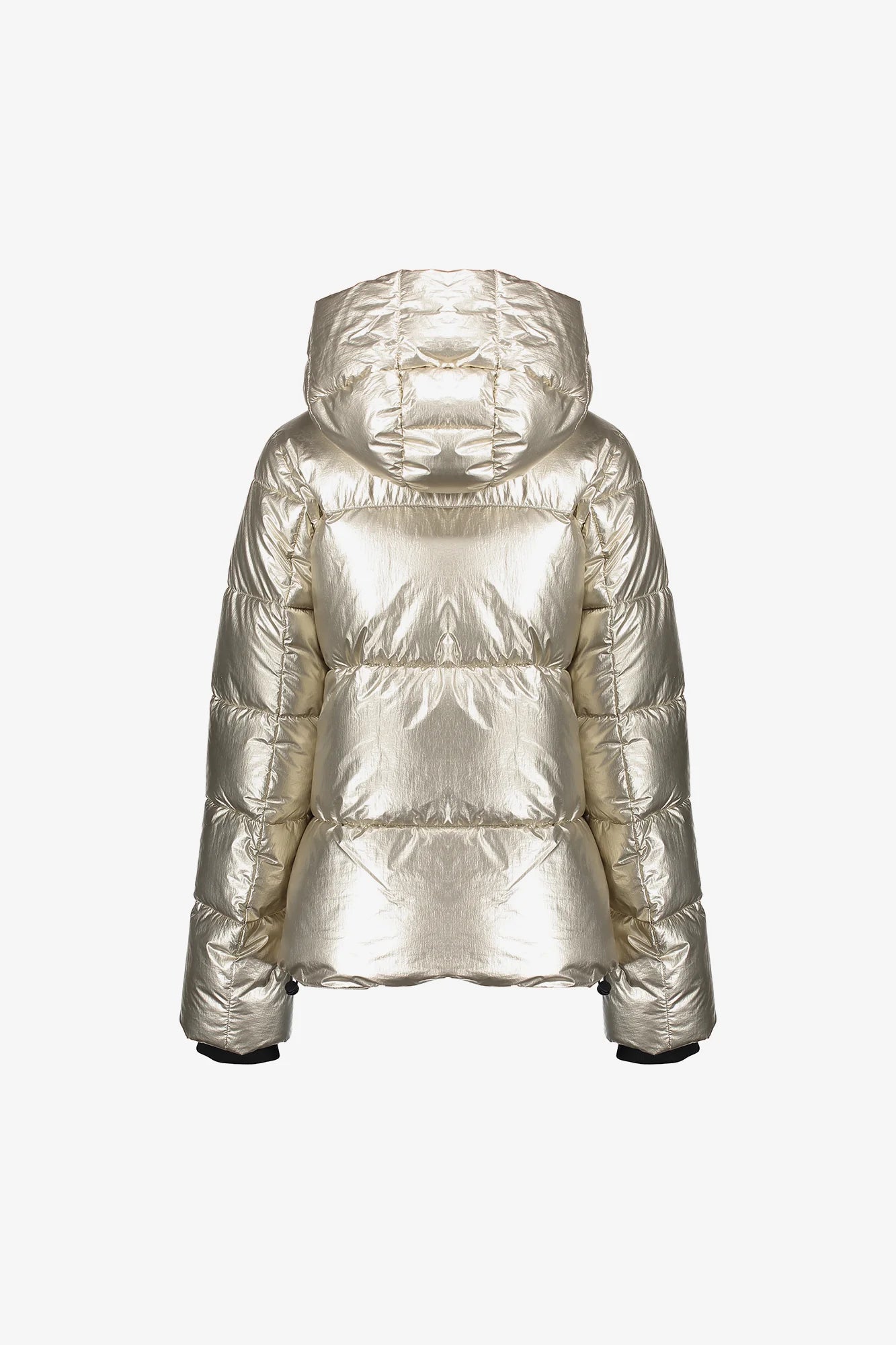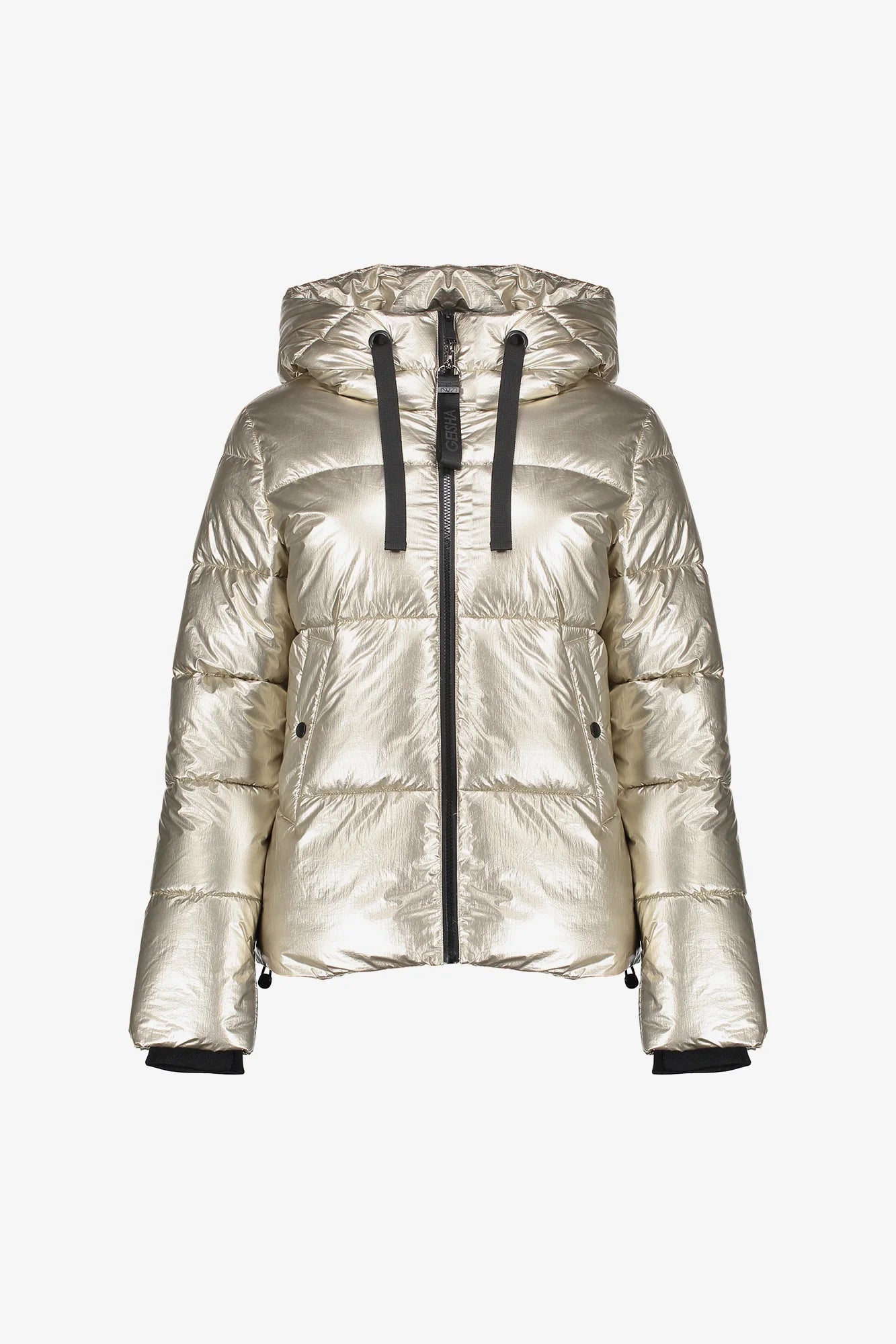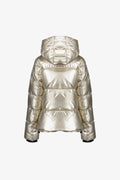 Trendy en warm! Deze metallic pufferjas van Geisha combineert stijl en comfort. De jas heeft een moderne goudkleurige glans, een afneembare capuchon en zwarte details die zorgen voor een stoere uitstraling. Perfect voor koude dagen met een fashionable touch.