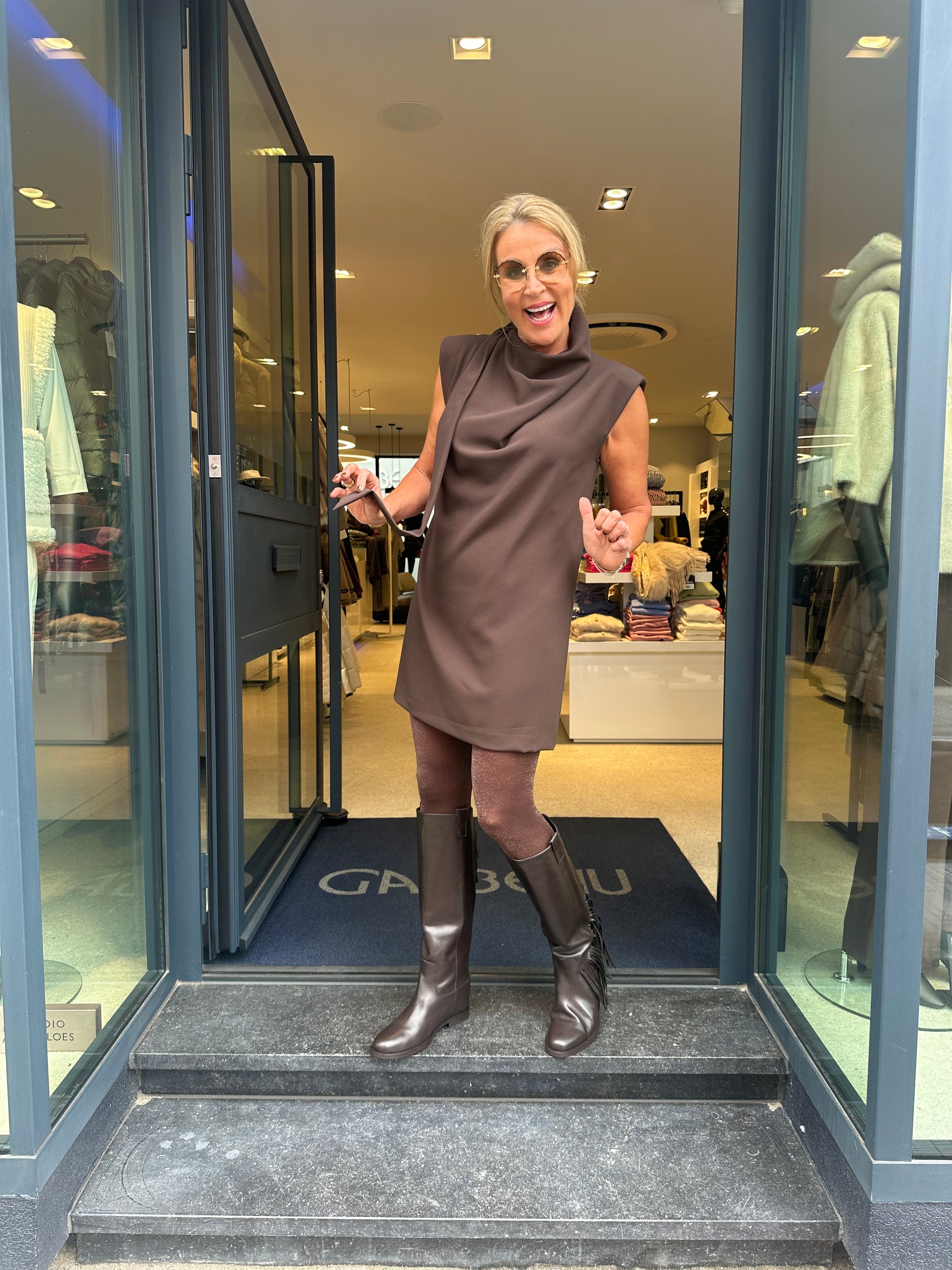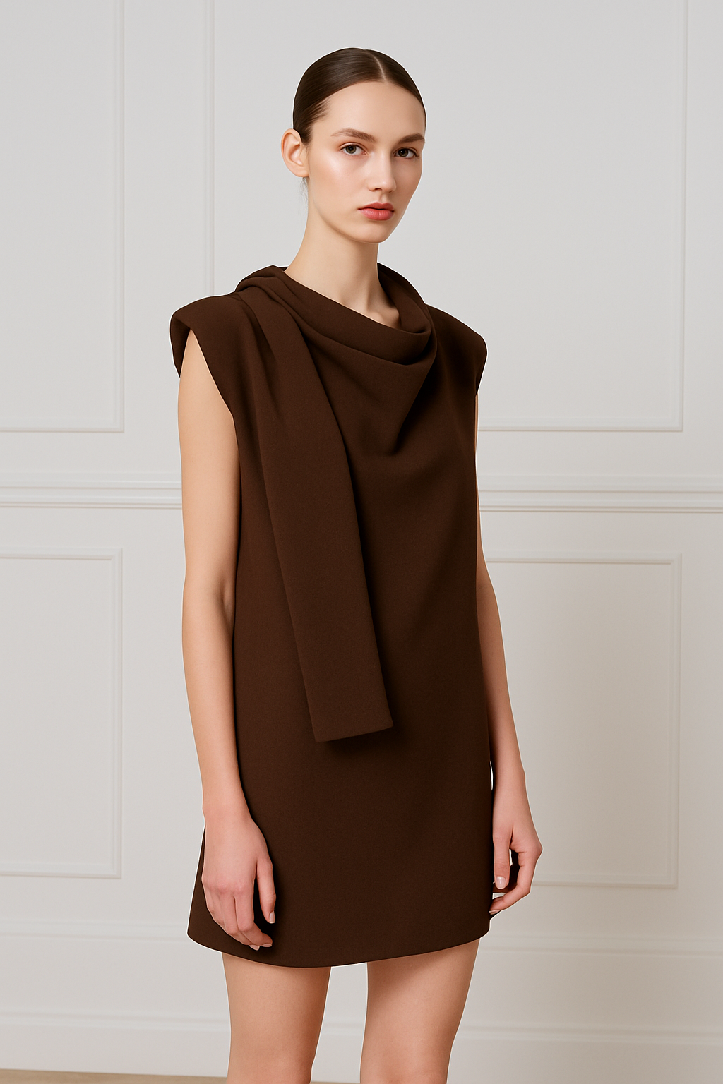 Deze stijlvolle japon in warme camelkleur straalt klasse en moderniteit uit. Het ontwerp is minimalistisch, maar krijgt een uniek karakter door de draperie en het opvallende schouderdetail dat elegant langs het voorpand valt. De rechte snit zorgt voor een comfortabele pasvorm, terwijl de verfijnde afwerking het geheel een luxe uitstraling geeft.
