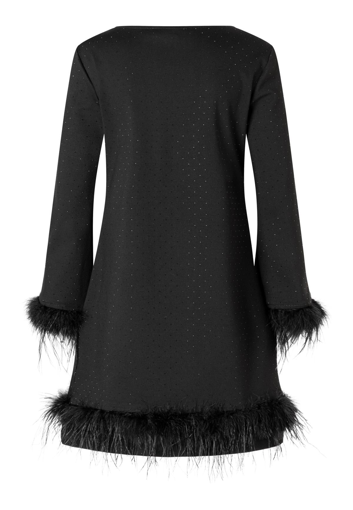 Deze elegante zwarte jurk van Ana Alcazar is een echte eyecatcher. Het subtiele sprankelende detail in de stof zorgt voor een luxe uitstraling, terwijl de speelse veeraccenten aan de mouwen en zoom een stijlvolle twist geven.