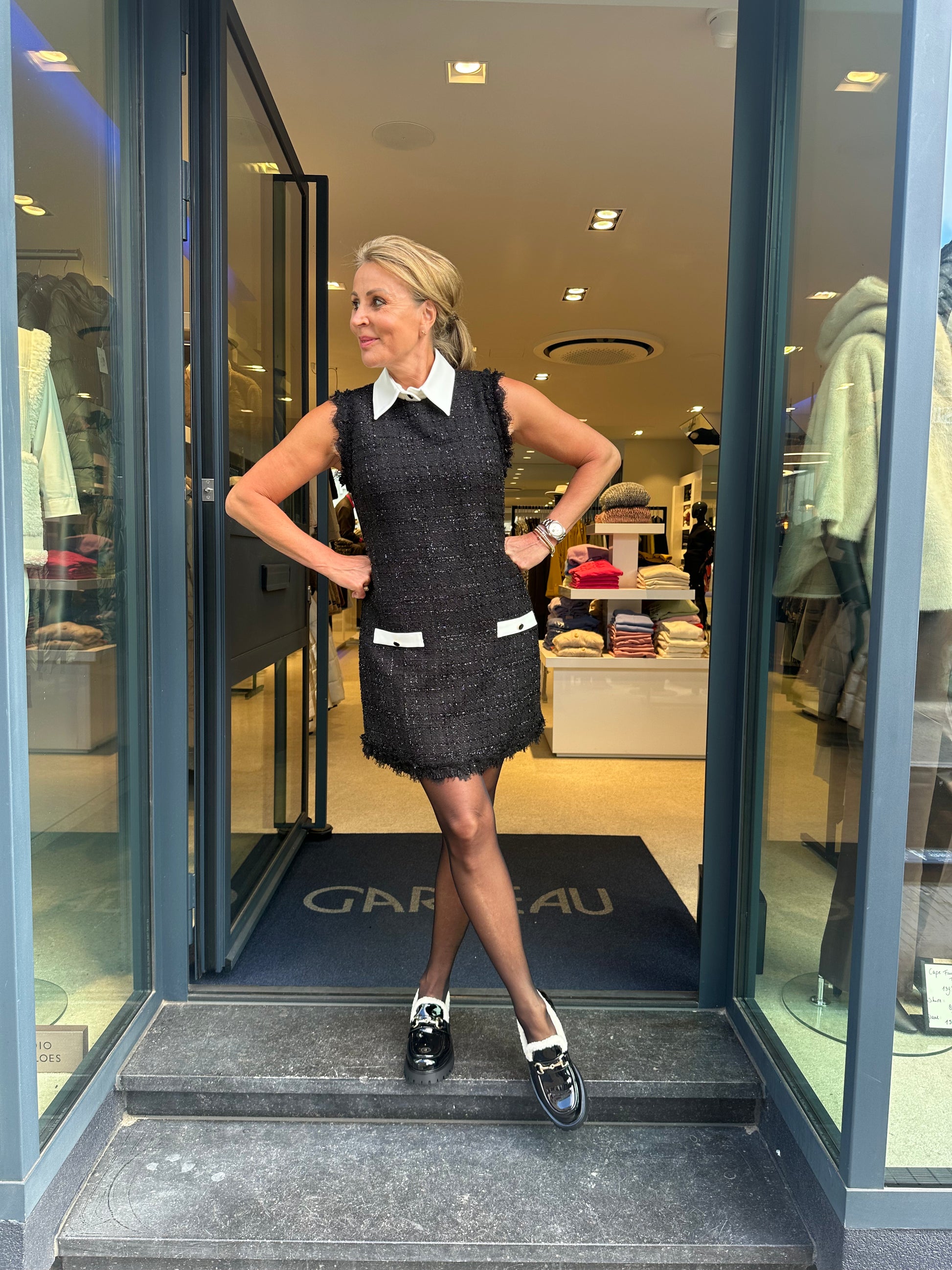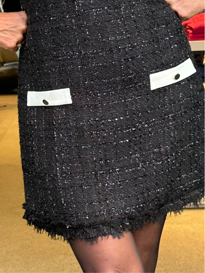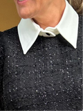 Deze zwarte tweed jurk is een echte klassieker met een moderne twist. Het losse witte kraagje geeft de jurk een frisse en speelse uitstraling. Dankzij de subtiele franjeafwerking en de decoratieve zakdetails heeft de jurk een luxe look.