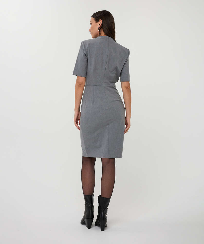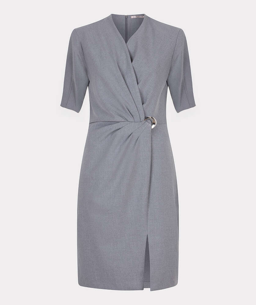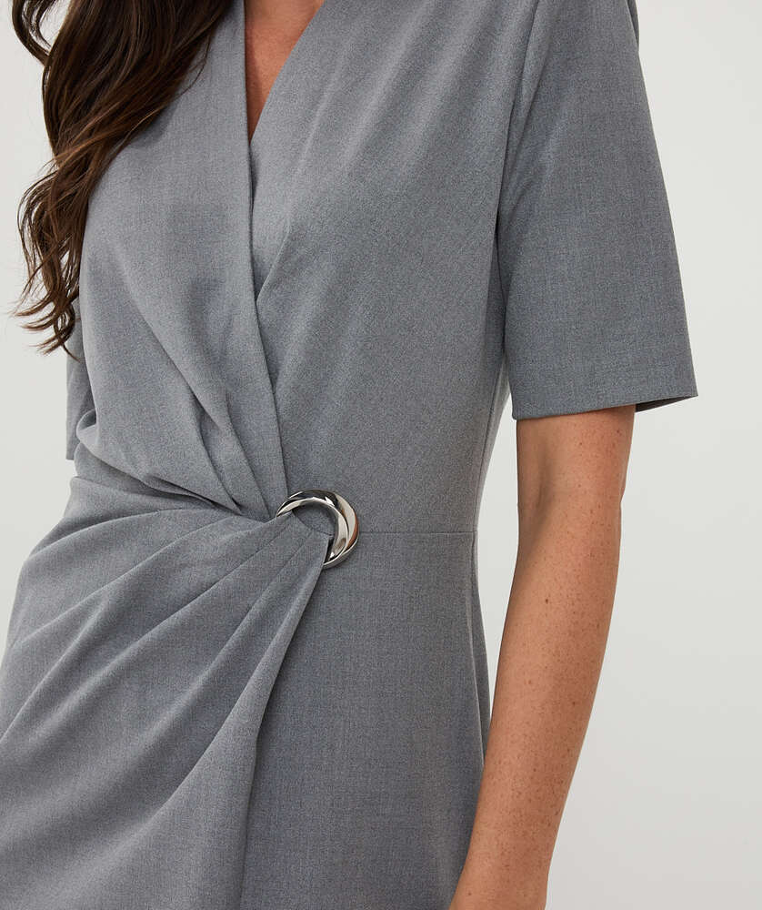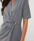 Deze stijlvolle grijze jurk combineert elegantie met comfort en is perfect voor zowel zakelijke gelegenheden als een avondje uit. Het verfijnde wikkelmodel met subtiel ringdetail accentueert de taille en zorgt voor een flatterende pasvorm. De halflange mouwen en de V-halslijn geven de jurk een tijdloze en moderne uitstraling.