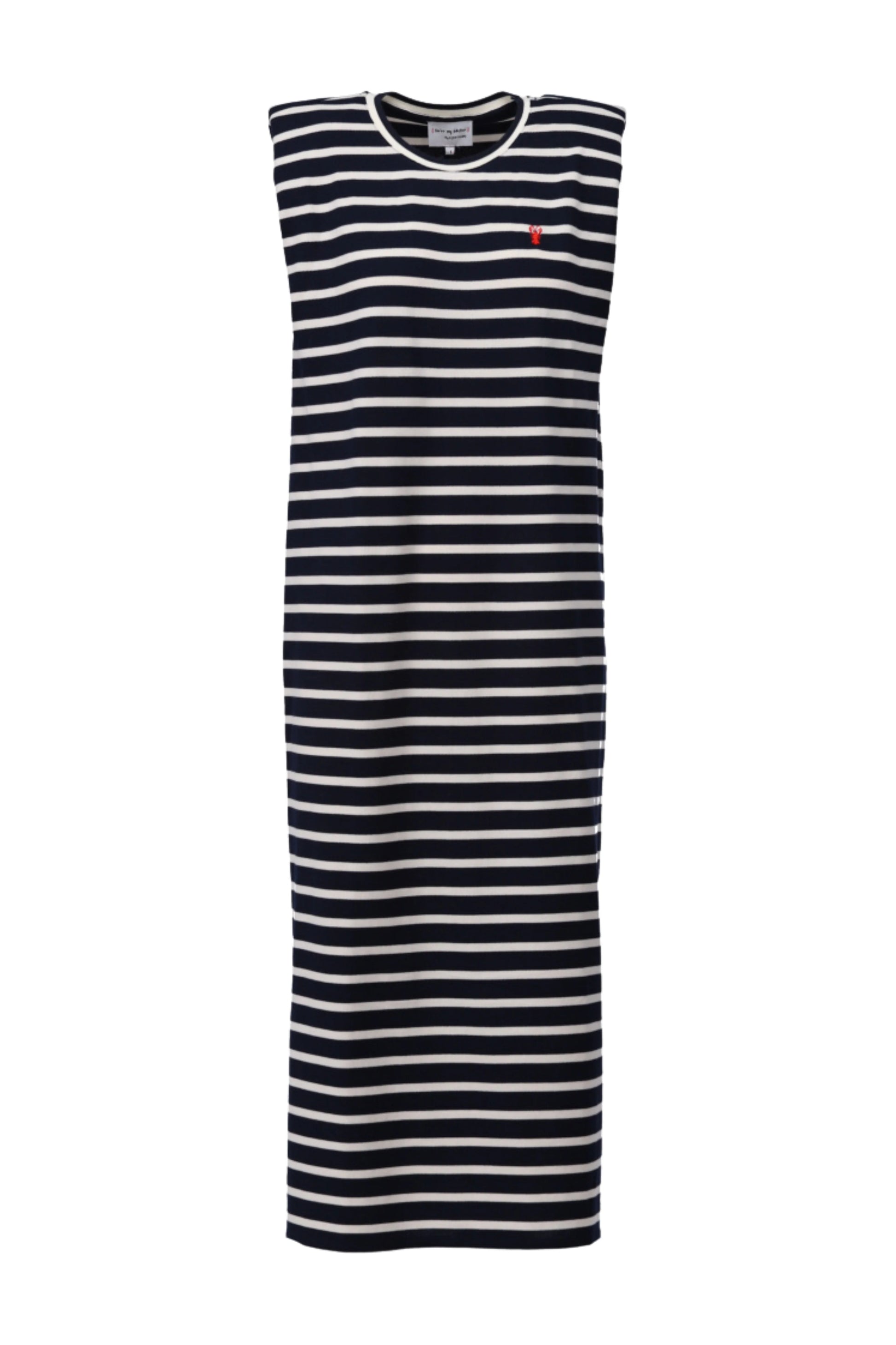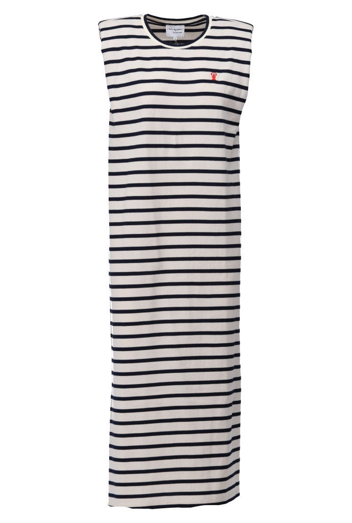 Deze stijlvolle gestreepte midi jurk is een echte must-have voor je garderobe. Het tijdloze navy-wit streeppatroon geeft de jurk een klassieke, frisse uitstraling, terwijl de rechte pasvorm zorgt voor ultiem draagcomfort.
