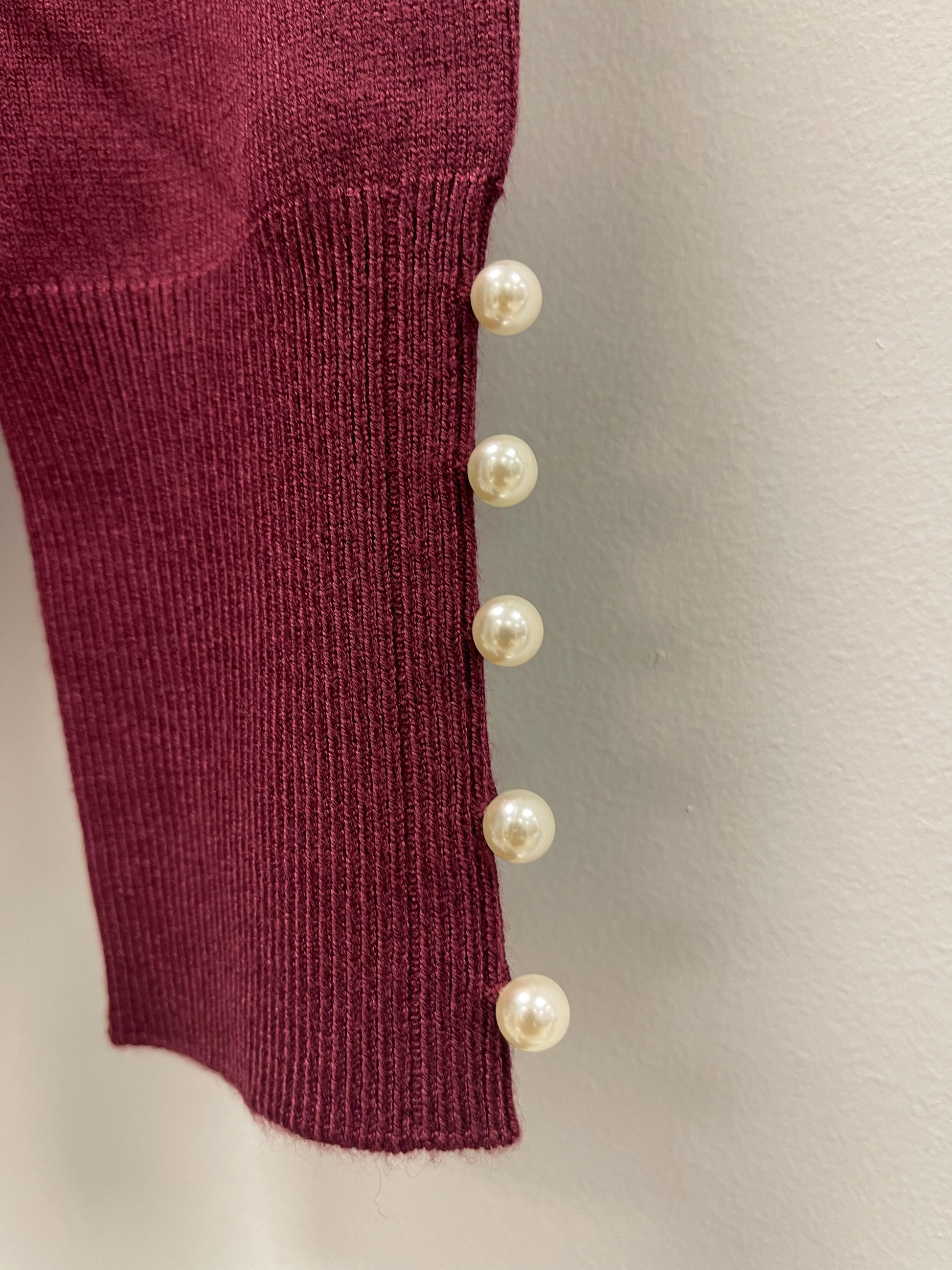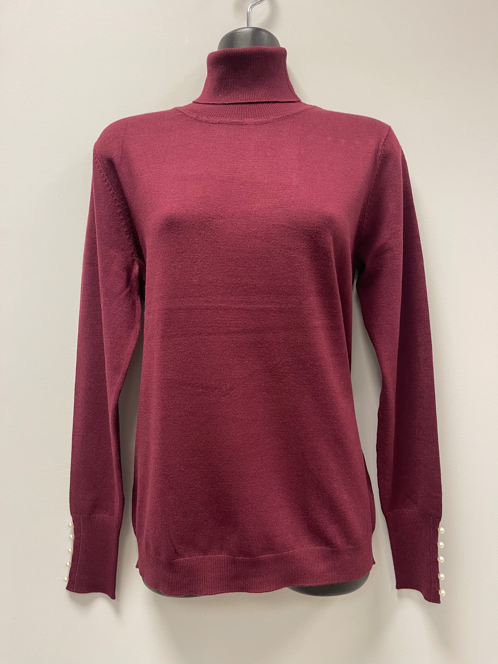Deze elegante coltrui in diepe bordeauxkleur is een echte klassieker met een moderne twist. De subtiele parelknopen op de manchetten geven de trui een vrouwelijke en chique uitstraling.
