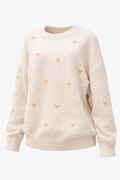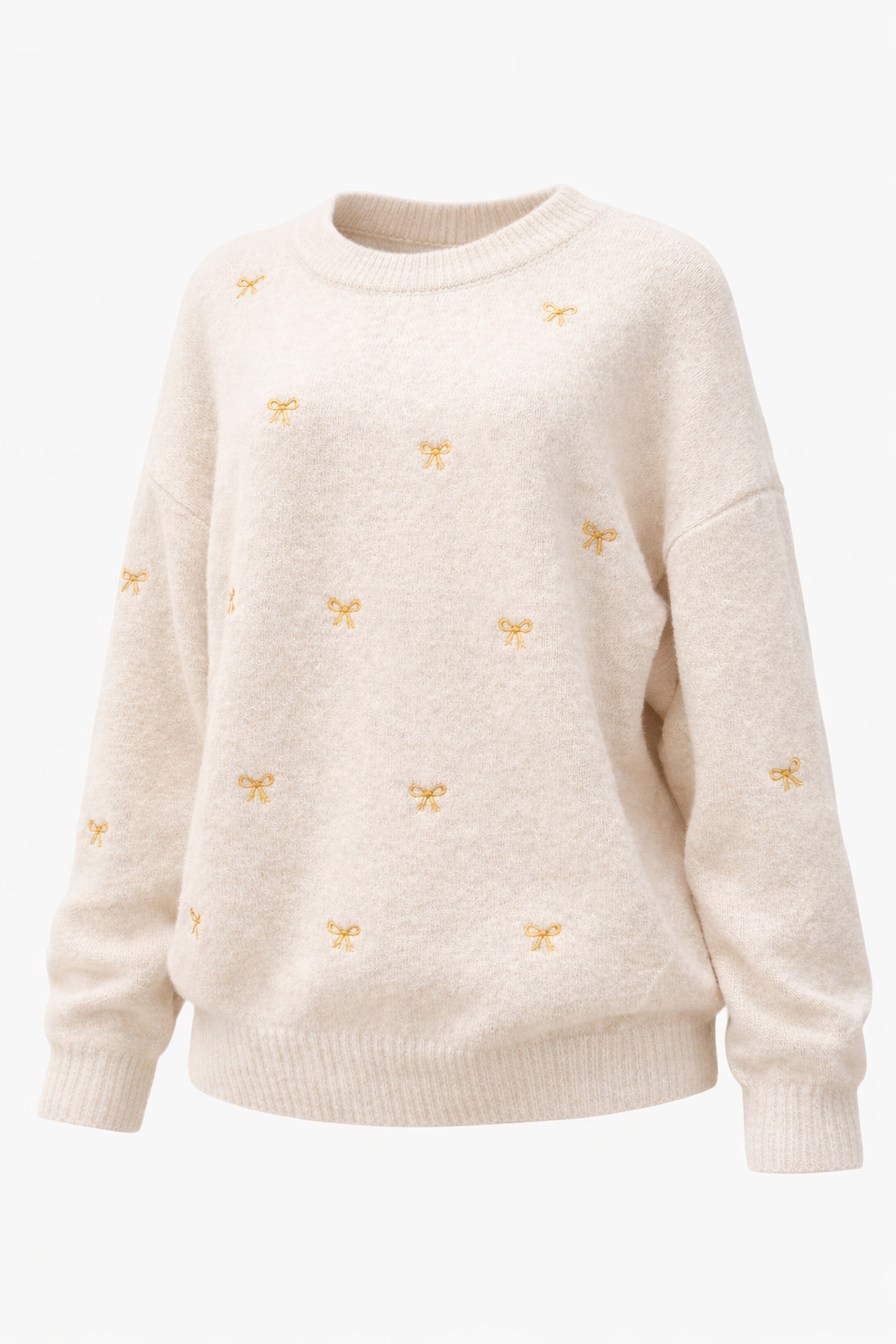 De subtiele gouden geborduurde strikjes geven de trui een elegante en vrouwelijke uitstraling, terwijl de comfortabele pasvorm zorgt voor ultiem draagcomfort. Perfect voor zowel casual dagen als een nette look met een twist.