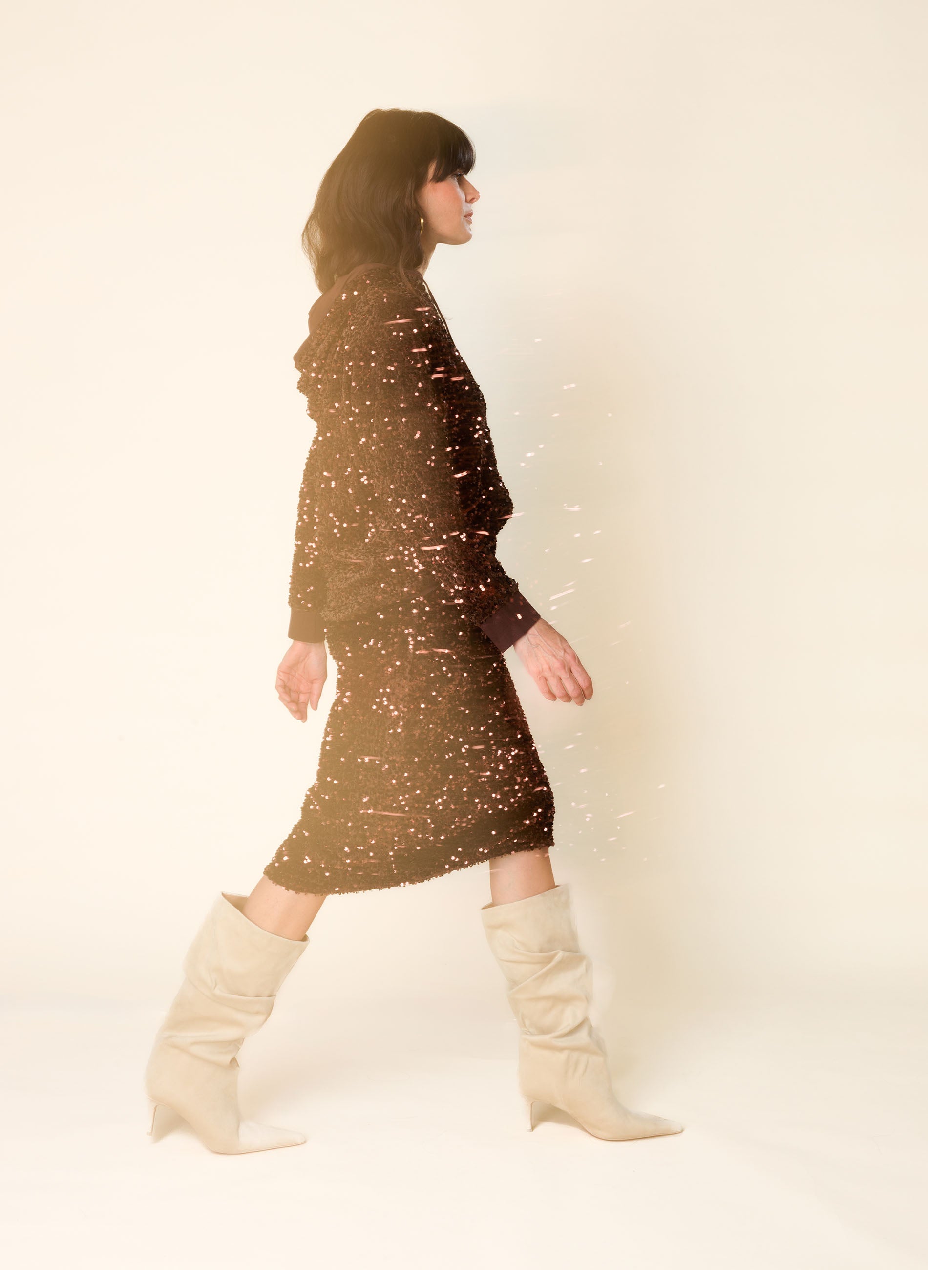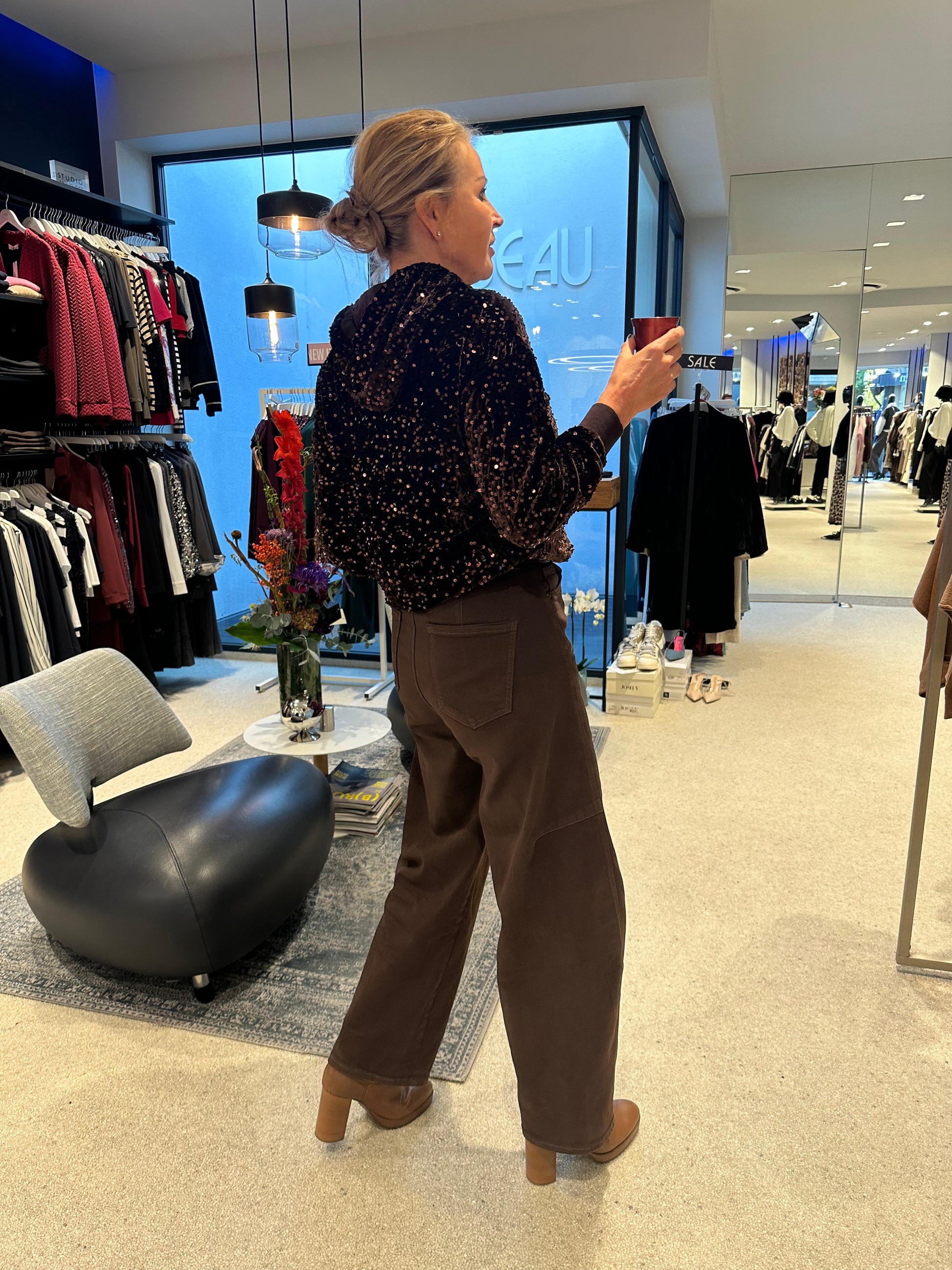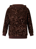 Deze prachtige hoodie is een echte eyecatcher! De diepe chocoladetint gecombineerd met een all-over paillettenlook geeft een luxueuze, feestelijke uitstraling zó comfortabel en toch glam. Dankzij de zachte voering draag je hem heerlijk casual met een jeans of op de bijpassende rok of leerlook broek, maar hij is ook perfect voor een avondje uit.