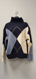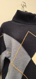 Deze prachtige gebreide trui combineert tijdloze elegantie met moderne kleuren. Het argyle patroon in navy, crème en zachte blauwtinten geeft een klassieke maar frisse uitstraling.