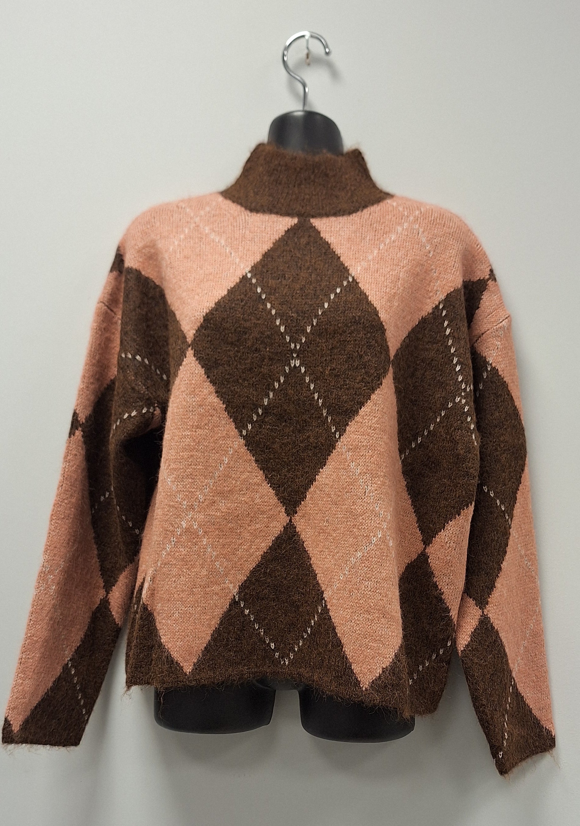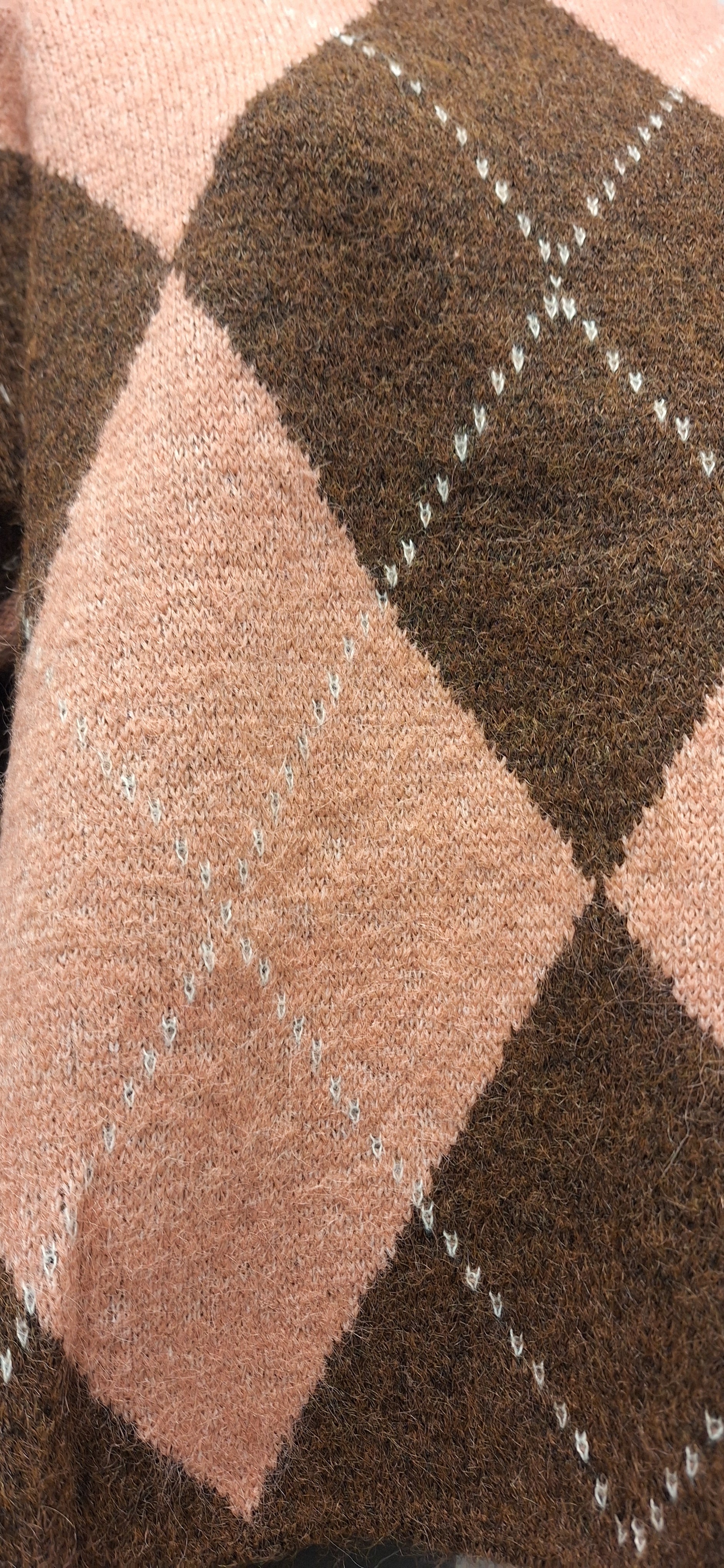 Deze prachtige argyle trui is een echte blikvanger voor het najaar en de winter. De zachte roze tint gecombineerd met warm bruin geeft een unieke, vintage geïnspireerde look.