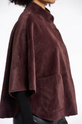 Zachte en luxueuze cape van imitatiebont. Deze cape heeft twee open zakken aan de voorkant, een drukknoopsluiting aan de voorkant, korte mouwen en splitdetails aan beide zijkanten.