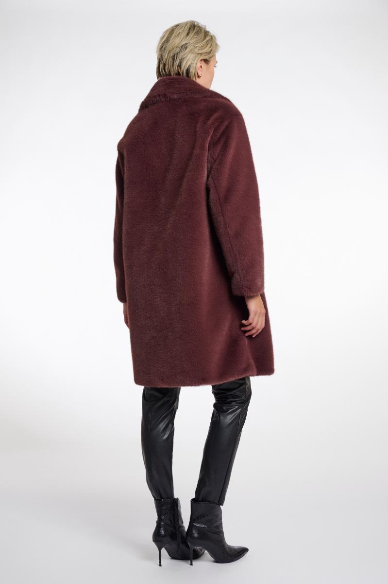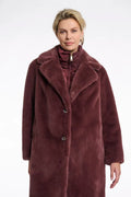 Voeg luxe en warmte toe aan je wintergarderobe met deze stijlvolle faux fur jas. De rijke bordeauxkleur en zachte textuur zorgen voor een verfijnde uitstraling, terwijl de klassieke pasvorm met knoopsluiting en brede reverskraag een tijdloze look geeft.