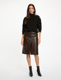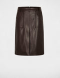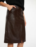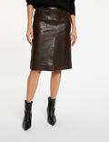 Deze donkerbruine rok van faux leather geeft je look een stoere én vrouwelijke uitstraling.