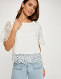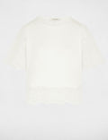Deze elegante witte top is een tijdloze toevoeging aan je garderobe. Het minimalistische ontwerp wordt verfijnd door sierlijke kanten details aan de mouwen en zoom, wat zorgt voor een vrouwelijke en stijlvolle uitstraling. De ronde hals en rechte pasvorm maken de top comfortabel én veelzijdig.