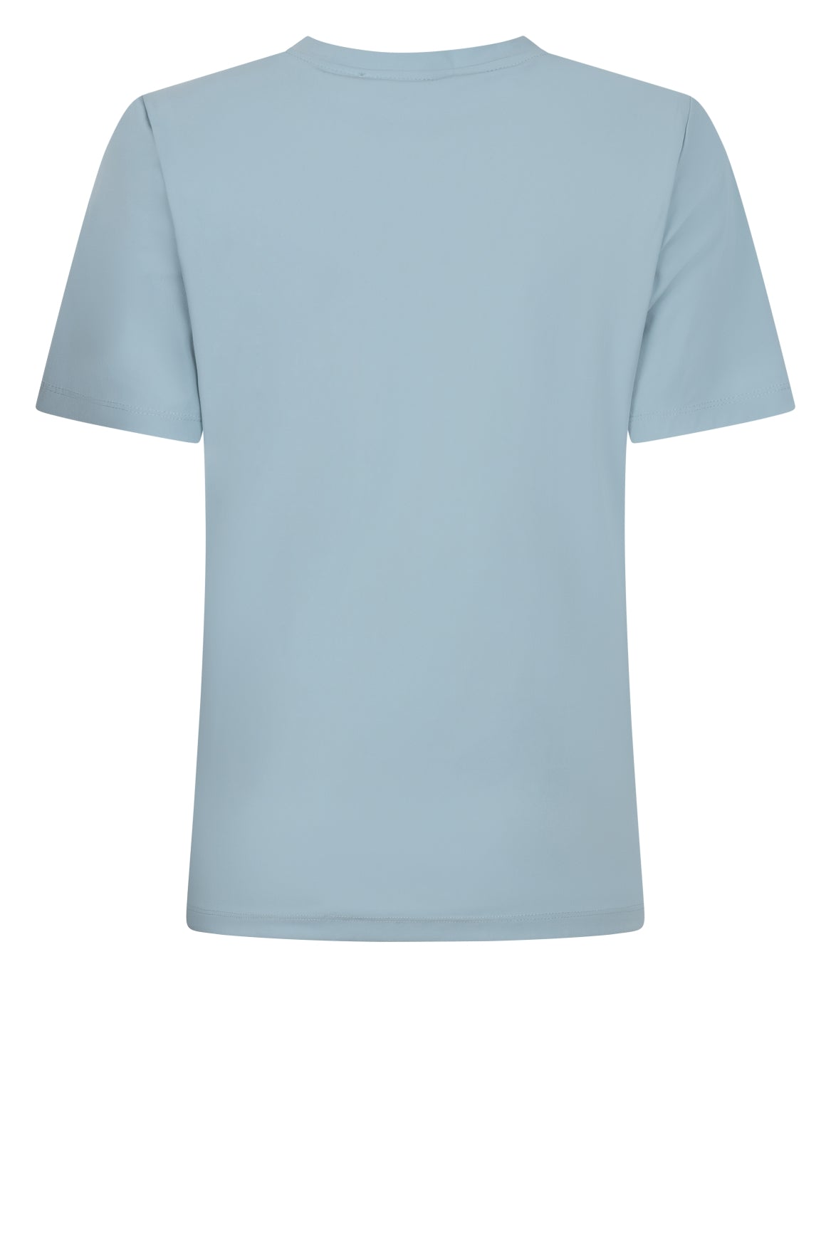 Het Travel T‑Shirt Selma Sea Green is een frisblauwgroen dames T‑shirt met ronde hals, korte mouwen en stijlvolle witte logo‑print op de borst.