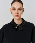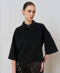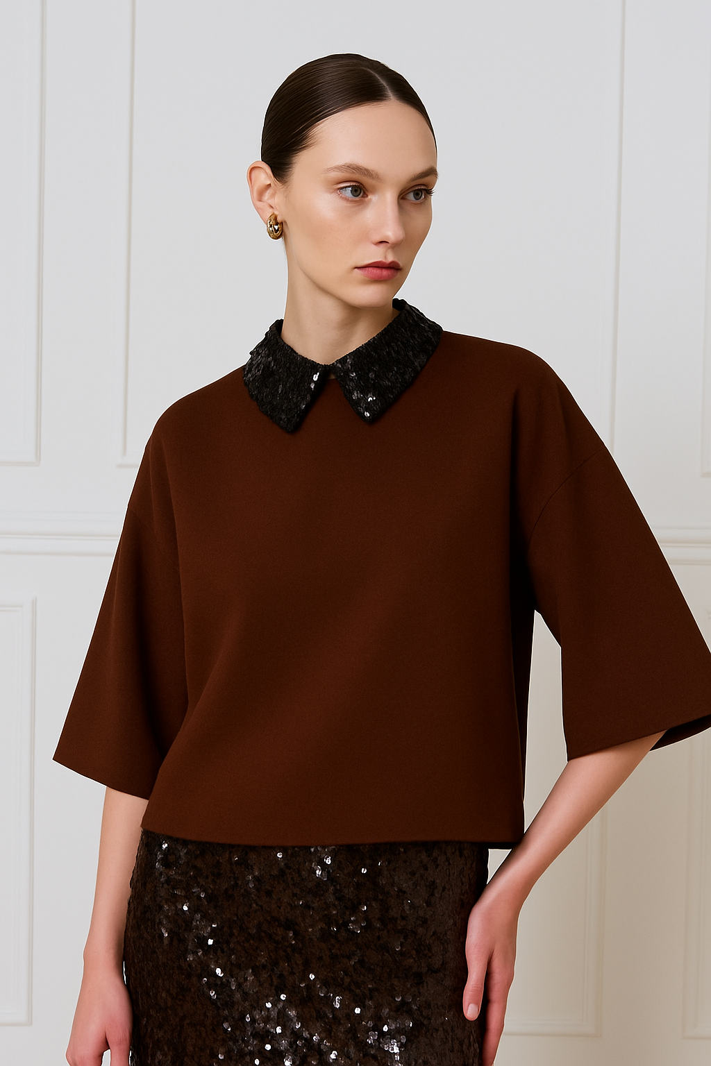 De losvallende pasvorm en driekwart mouwen zorgen voor een moderne en comfortabele look, terwijl de kraag afgewerkt met glanzende pailletten een verfijnde, feestelijke touch geeft.