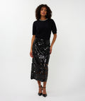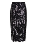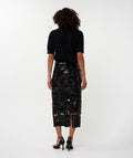 De rok is gevoerd tot halverwege, waardoor het kant subtiel doorschijnt aan de zoom voor een speels effect. Combineer met een eenvoudige top of knit voor een moderne partylook.