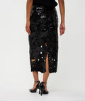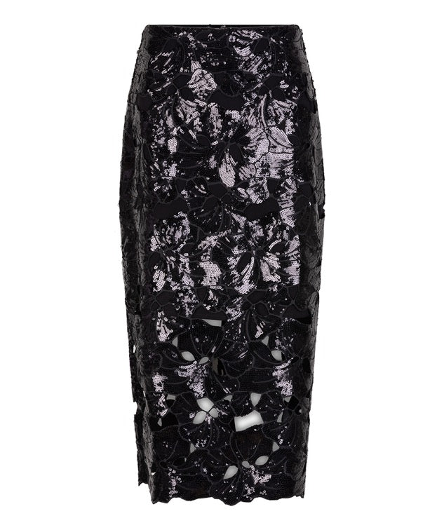 Deze prachtige kanten rok van Esqualo is een echte eyecatcher. De midi-lengte en subtiele glans van de pailletten geven de rok een stijlvolle, feestelijke uitstraling. De verfijnde bloemenkant zorgt voor een elegante, vrouwelijke look — perfect voor een speciale gelegenheid of een avondje uit.