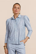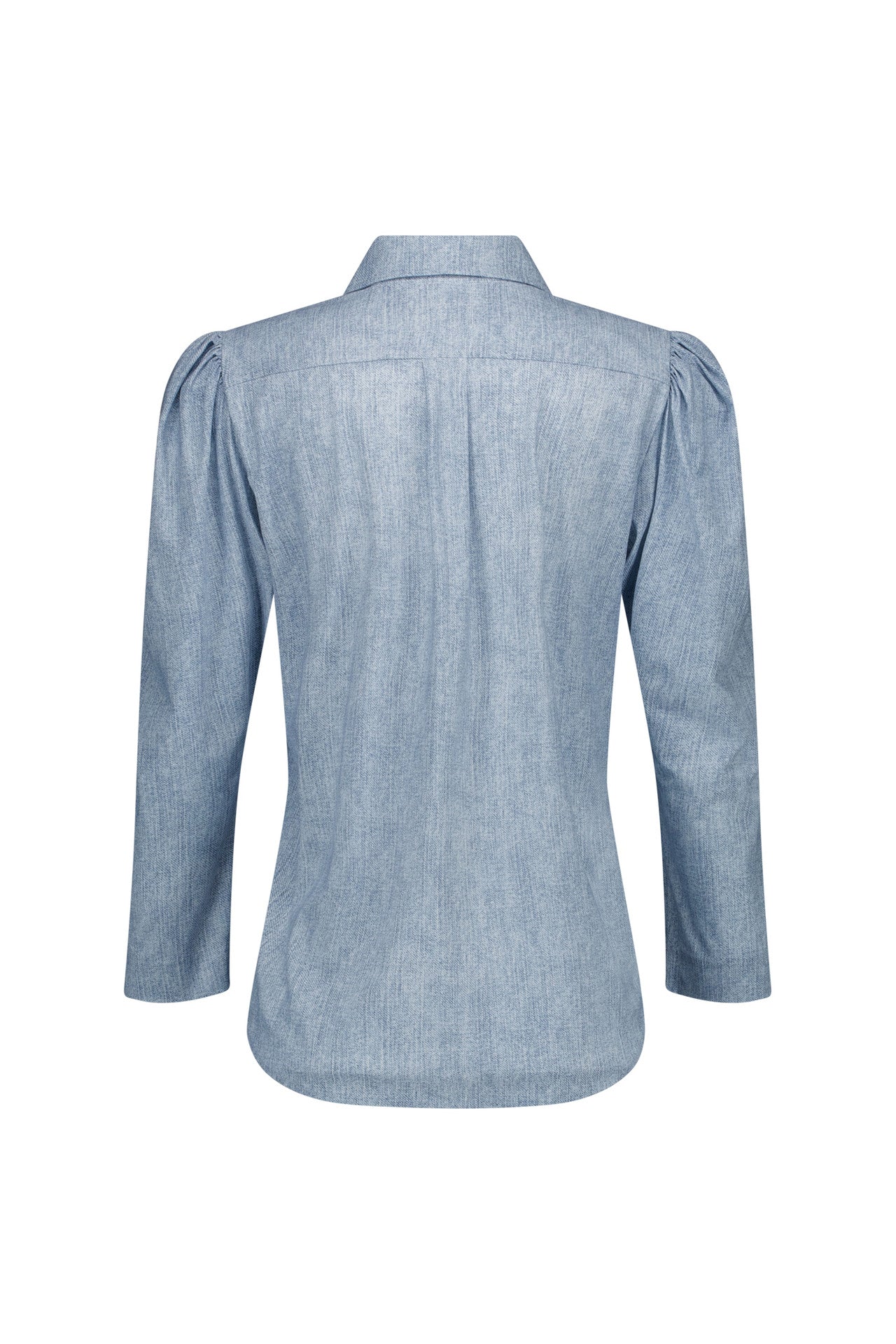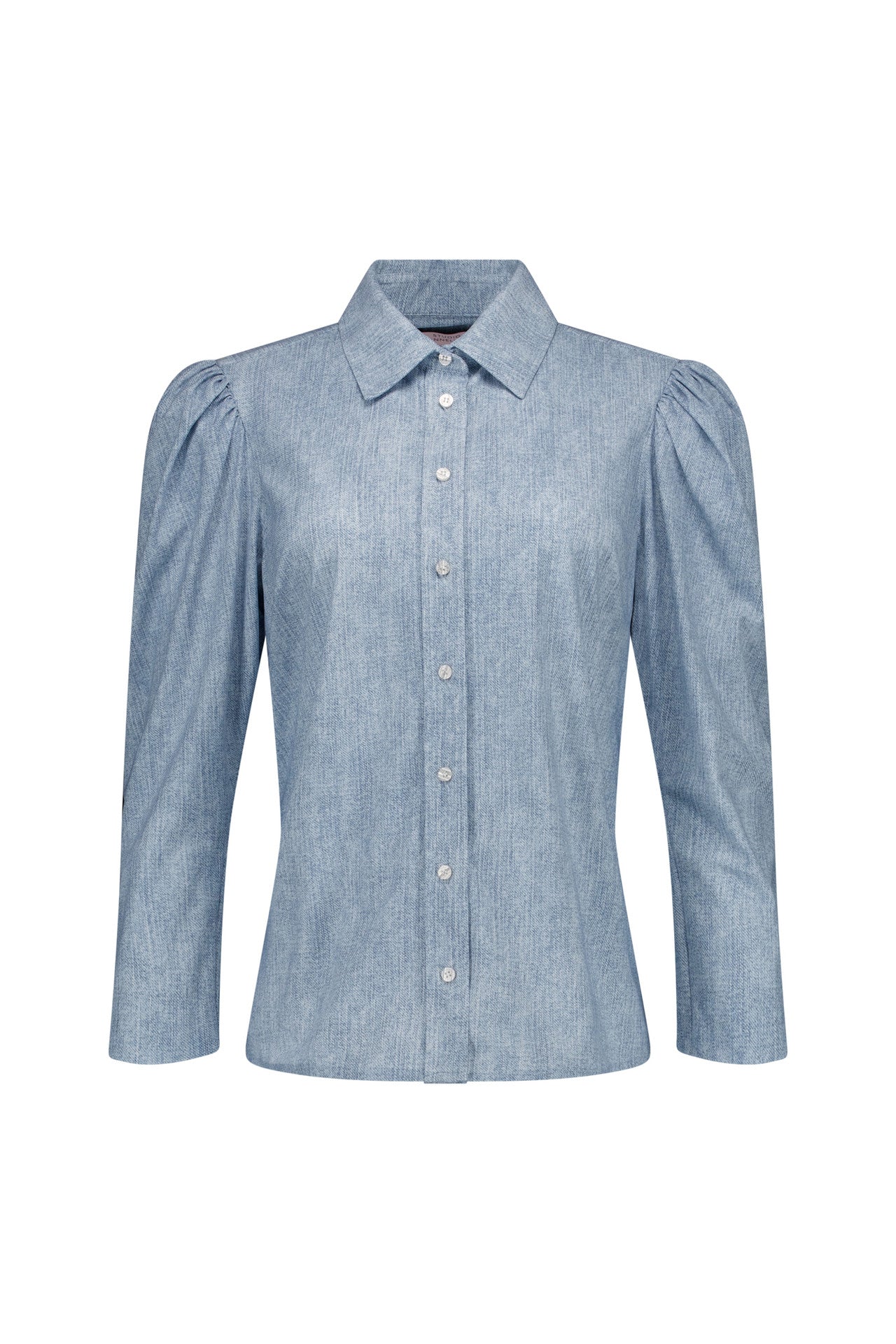 De Amanda denim blouse van Studio Anneloes is een stijlvolle blouse met een denim print in de kleur Denim Light. De regular fit en de Medium Travelstof zorgen voor een comfortabele en verzorgde pasvorm, terwijl de pofmouwen en klassieke details het ontwerp een vrouwelijke en moderne uitstraling geven.