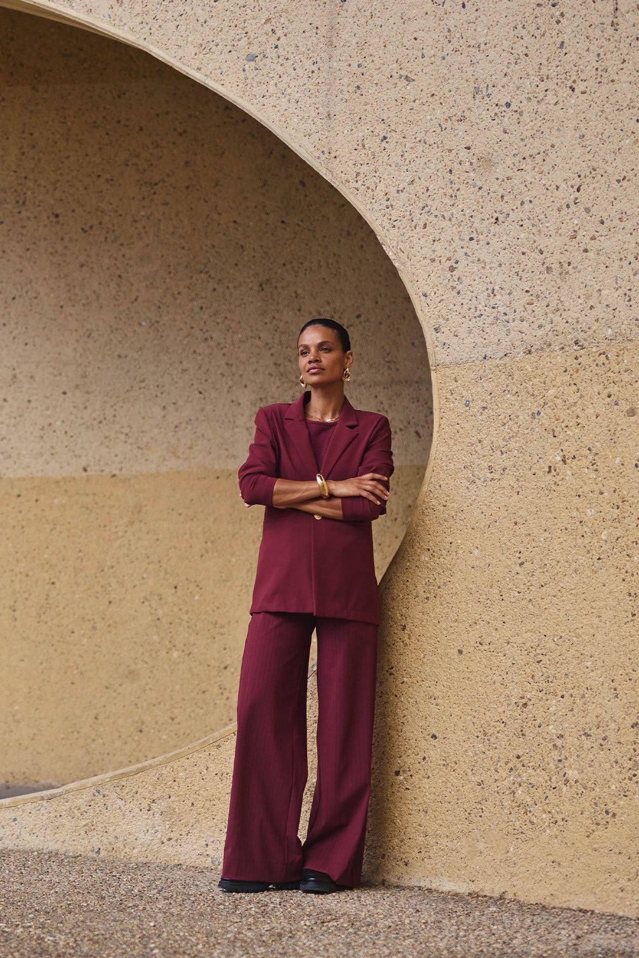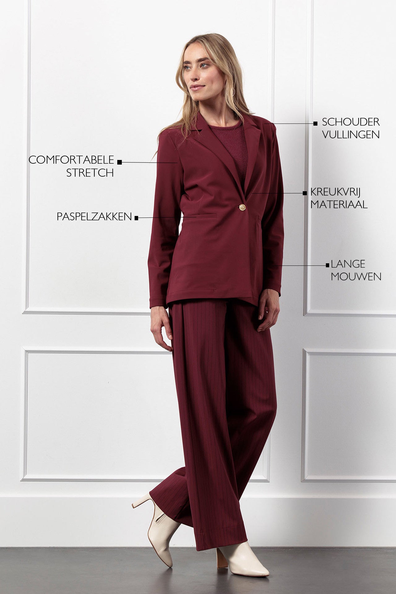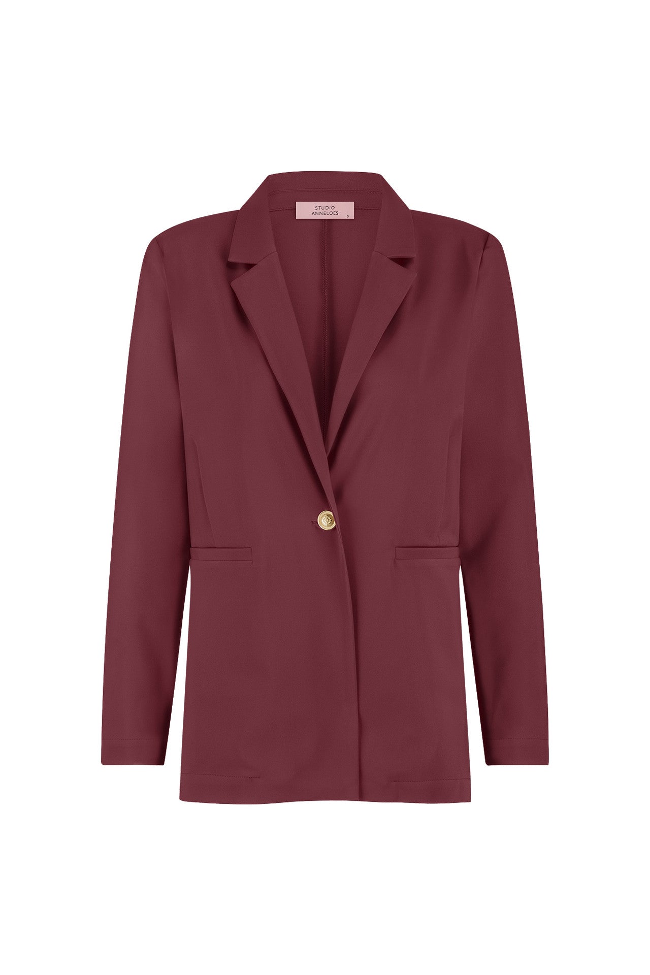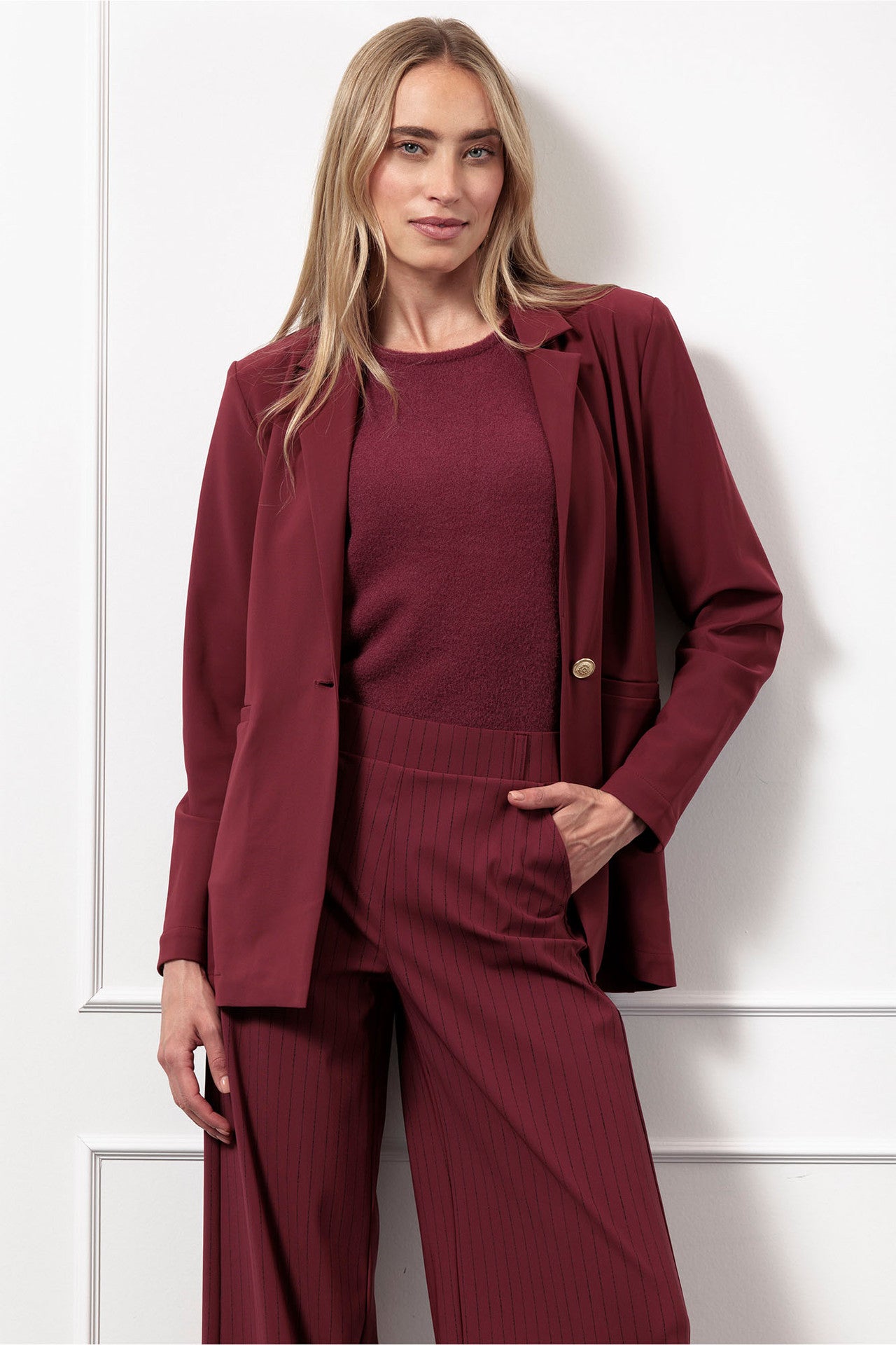 De diepe kleur Bordeaux, de comfortabele Bonded Travelstof en verfijnde details zoals de gouden knoop maken deze blazer een perfecte aanvulling op jouw garderobe.