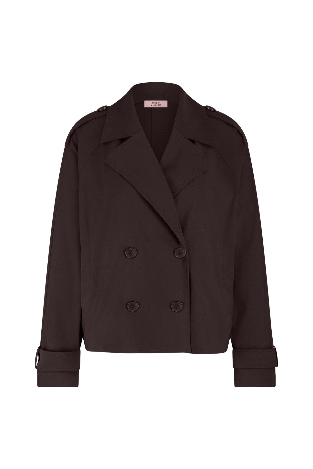 De Cato bonded trenchcoat van Studio Anneloes brengt klassieke elegantie en modern comfort samen. In de diepe kleur Espresso krijgt dit korte trenchcoat-model een krachtige uitstraling, terwijl de details zorgen voor een stijlvolle finishing touch.