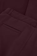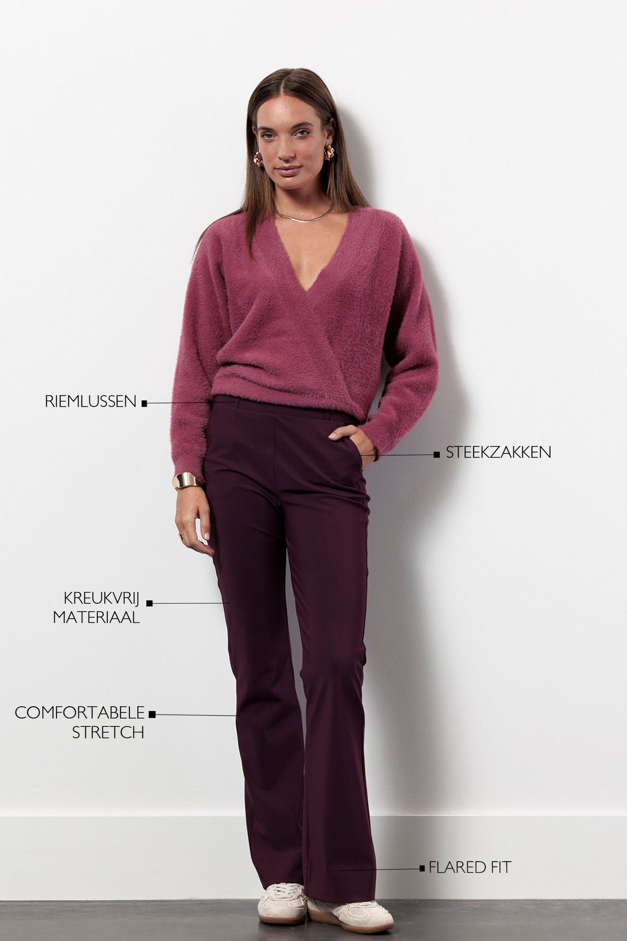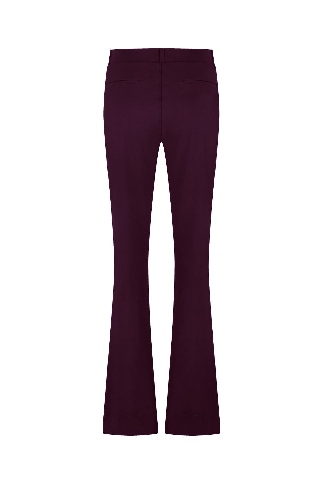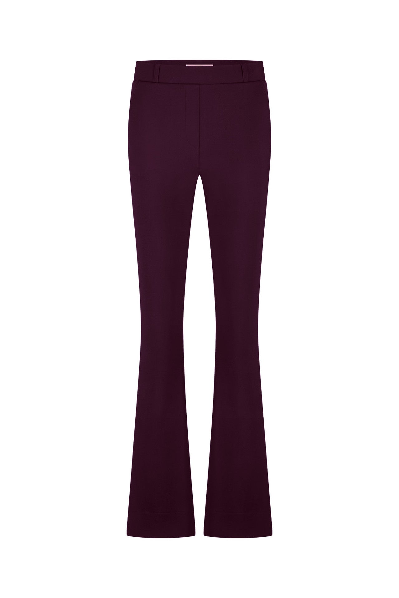 Deze donkerpaarse broek straalt luxe en kracht uit. De kleur Blackberry heeft een diepe, elegante toon en combineert moeiteloos met andere warme tinten zoals Dusty Pink, Ecru en Espresso. Dankzij de Bonded Travelstof blijft de pasvorm strak en elegant, zonder in te leveren op comfort. De elastische tailleband zorgt daarbij voor extra bewegingsvrijheid.