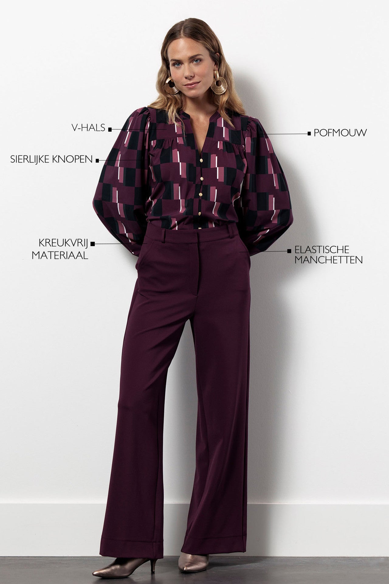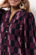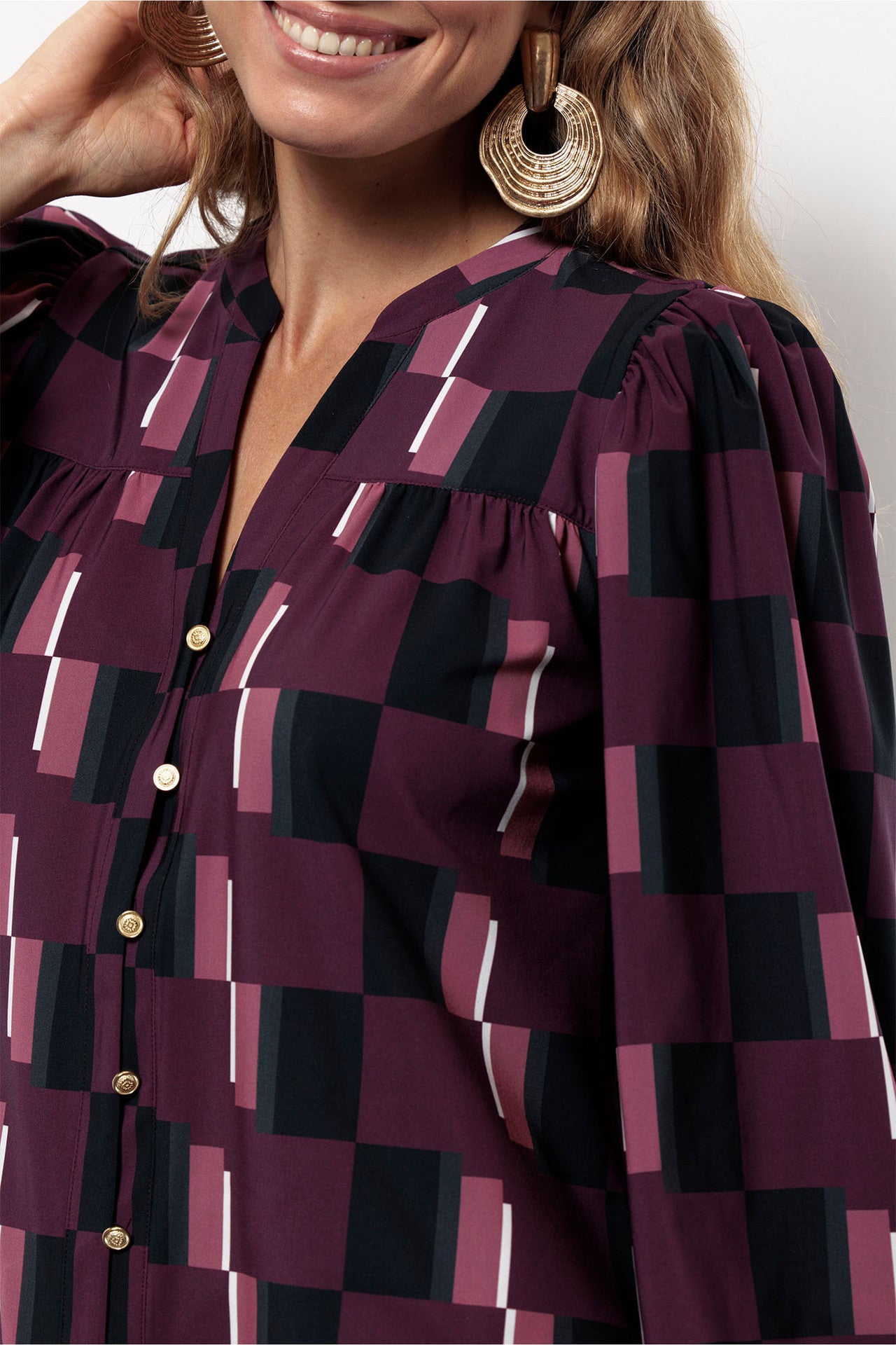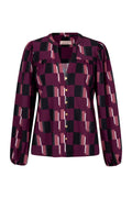 De rijke kleurencombinatie in de geometrische print en het vrouwelijke silhouet maken deze blouse een uitgesproken keuze voor de dagen waarop je net iets extra’s wilt.