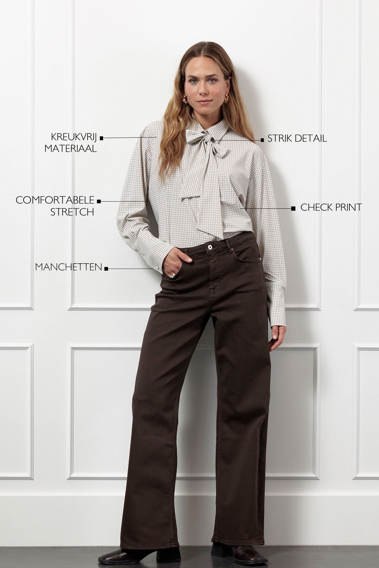 De afneembare strik bij de hals kun je op meerdere manieren stylen: nonchalant gestrikt, los hangend of zelfs als ceintuur