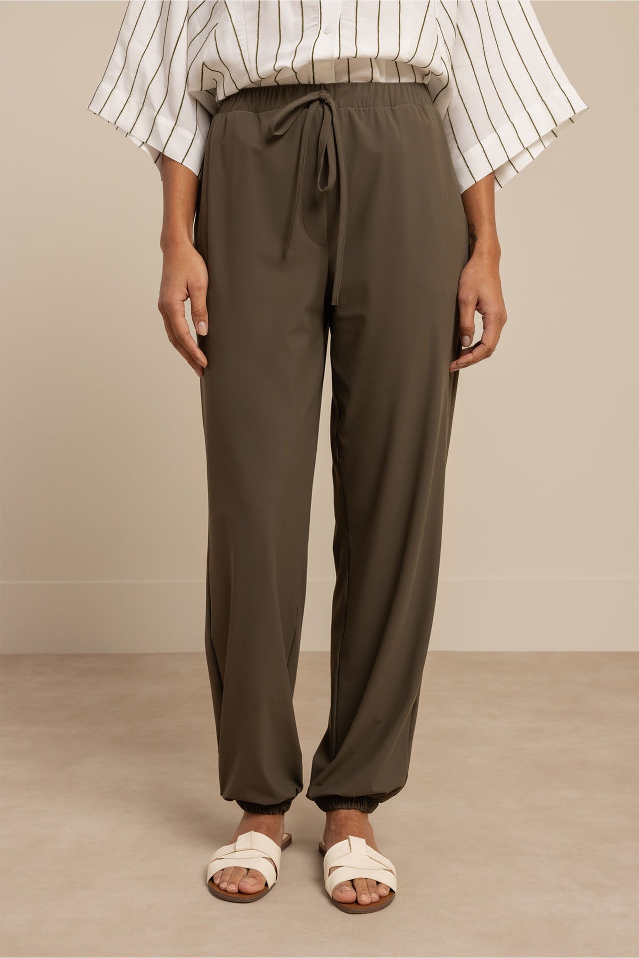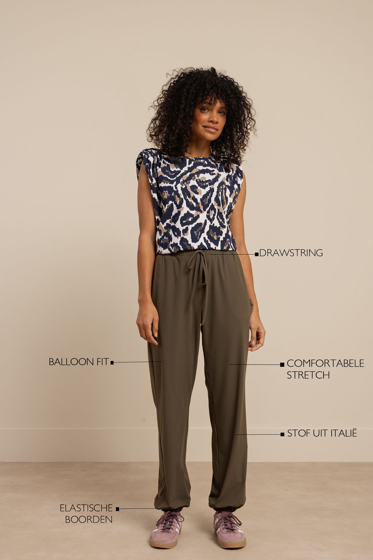 De Mariel balloon trousers van Studio Anneloes is een comfortabele broek met een moderne en speelse uitstraling. De Balloon fit en de soepele Medium Travelstof zorgen voor een luchtig silhouet, terwijl de elastische boorden bij de enkels het model een eigentijdse twist geven. In New Army is dit een veelzijdig statement.