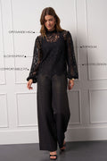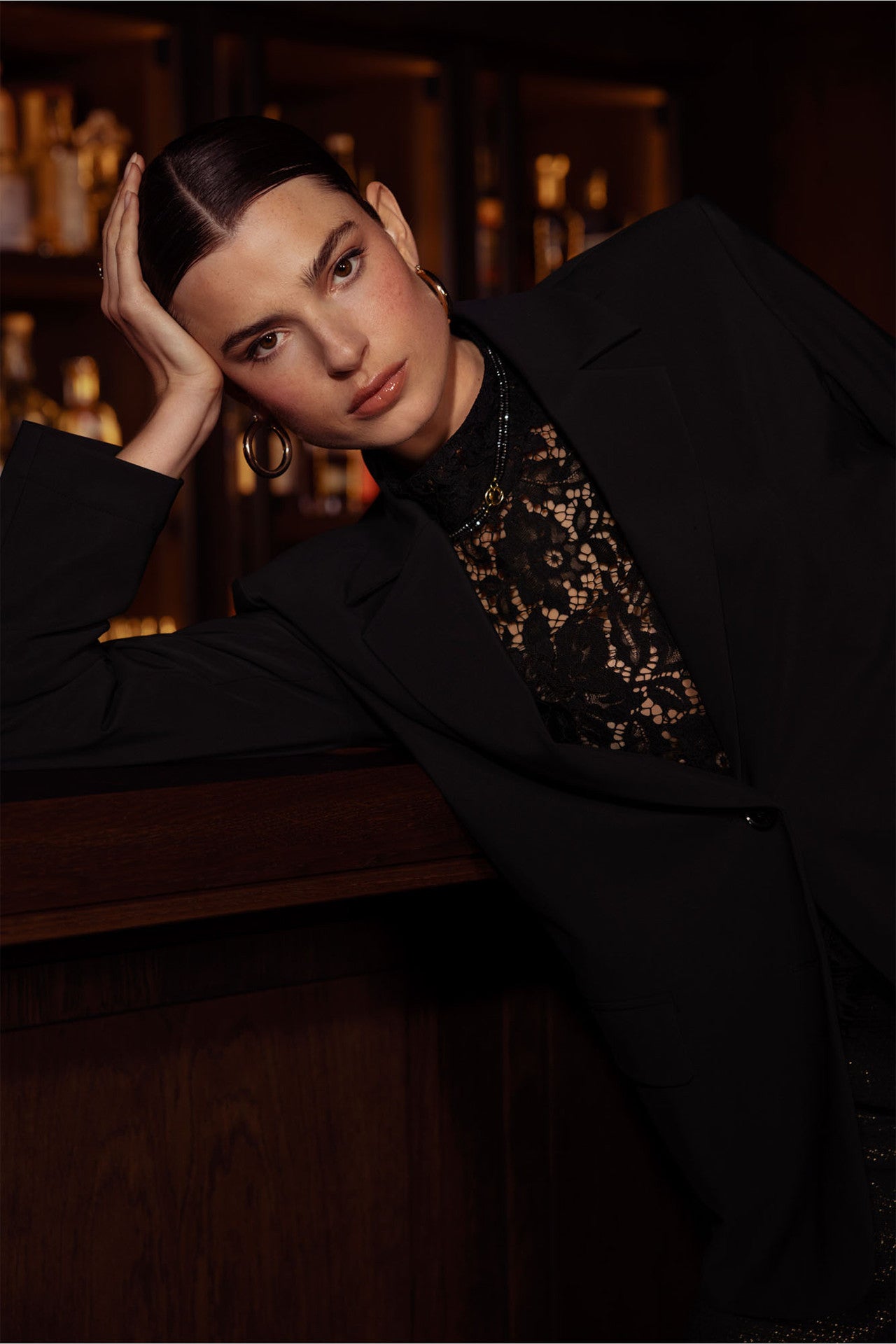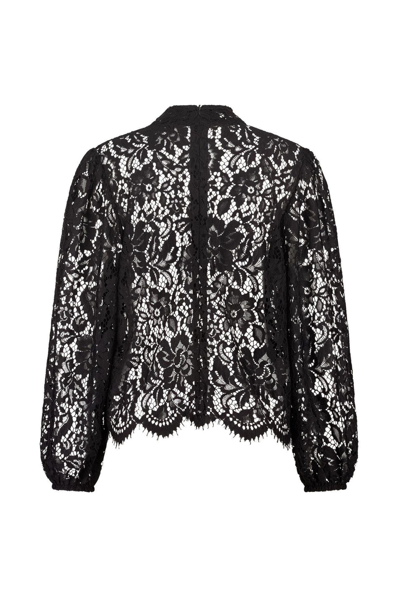 Deze zwarte top is gemaakt van rijk kant dat het silhouet prachtig omlijst. De gesculpte zoom zorgt voor een zachte afwerking aan de onderkant en benadrukt het vrouwelijke karakter van het ontwerp. Dankzij de regular fit valt de top soepel langs het lichaam, terwijl de pofmouwen en hoge halslijn zorgen voor een stijlvolle, klassieke look.