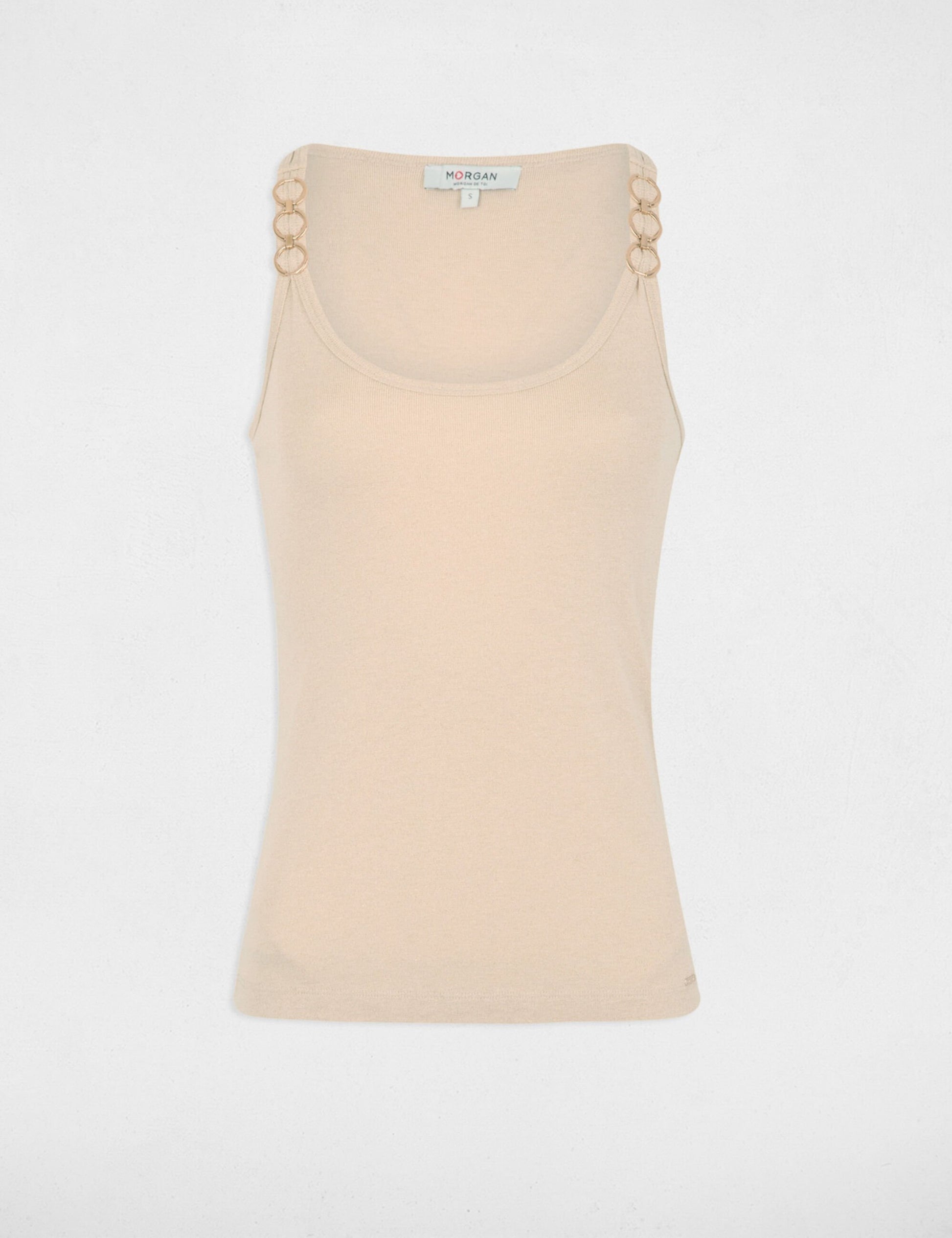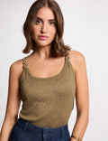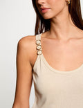 Deze elegante mouwloze top in een off white en arms kleur is een veelzijdige must-have voor elke garderobe. De verfijnde ringdetails bij de schouders geven een subtiele, vrouwelijke twist aan het minimalistische design.