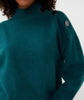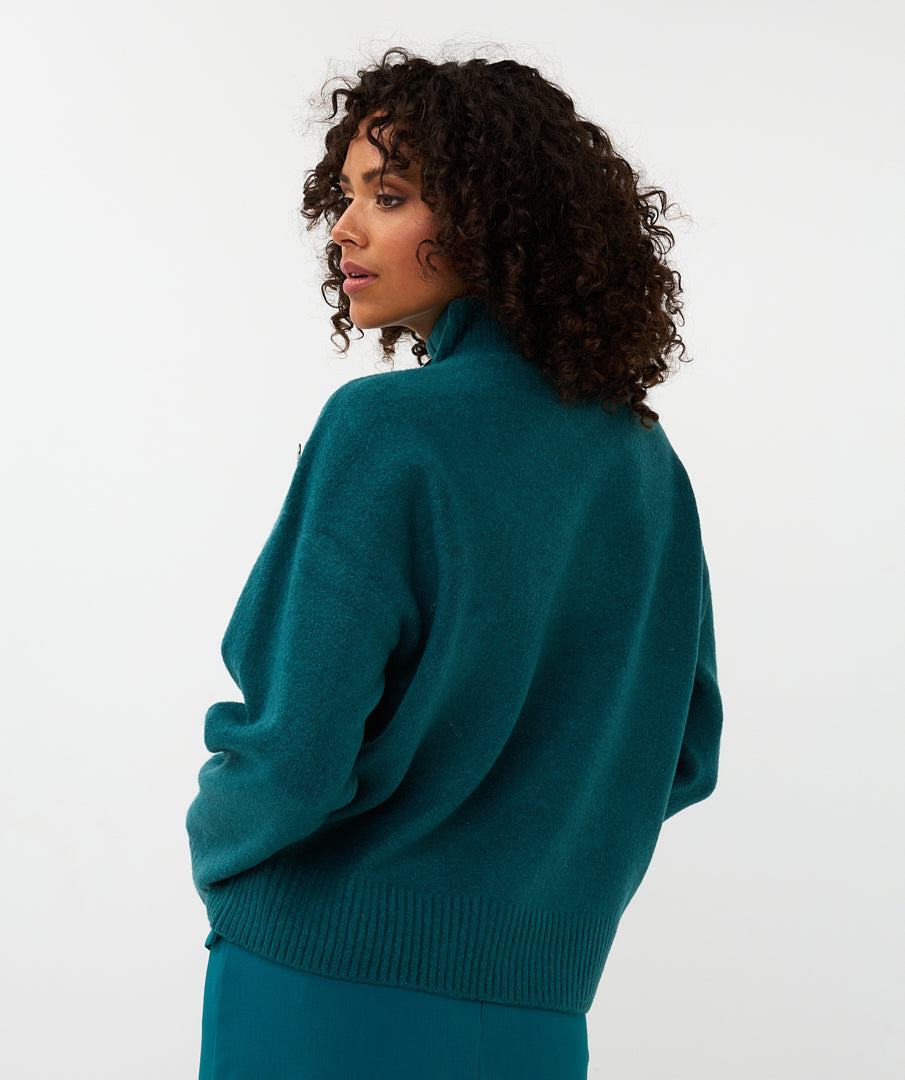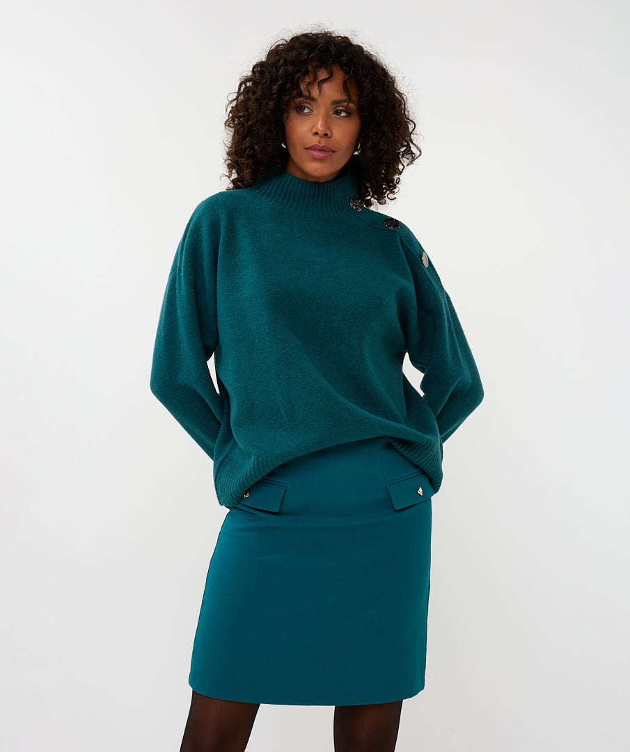 - Model: trui met knoopdetail op de schouder